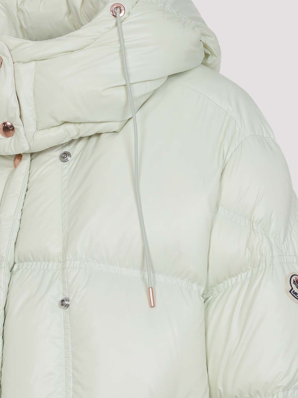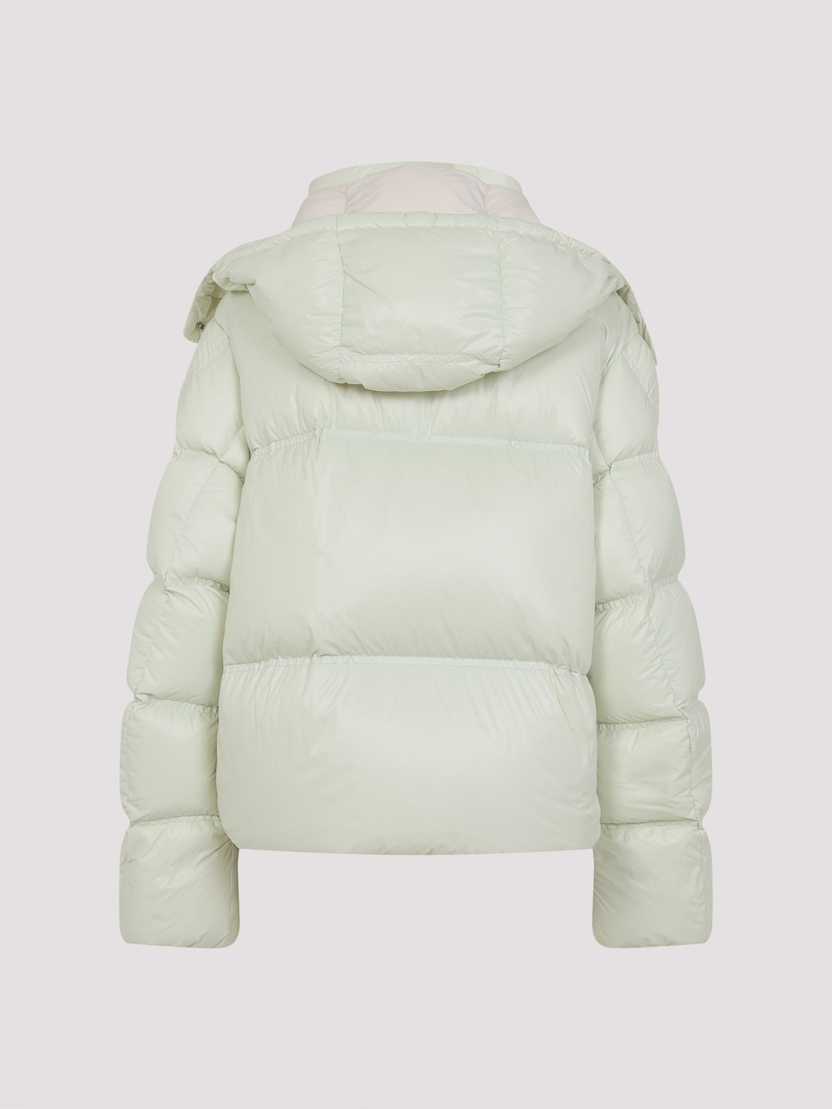 Moncler naturgrüne Erea Jacke, gefertigt mit Standfuß, Stehkragen, tonale Kapuze, geknöpfte, tonale Kordelzug, Brustklappe, Knopftasche, Logo auf der rechten Seite, lange Ärmel, gerader Saum, tonale Nähte, gepolstertes Design