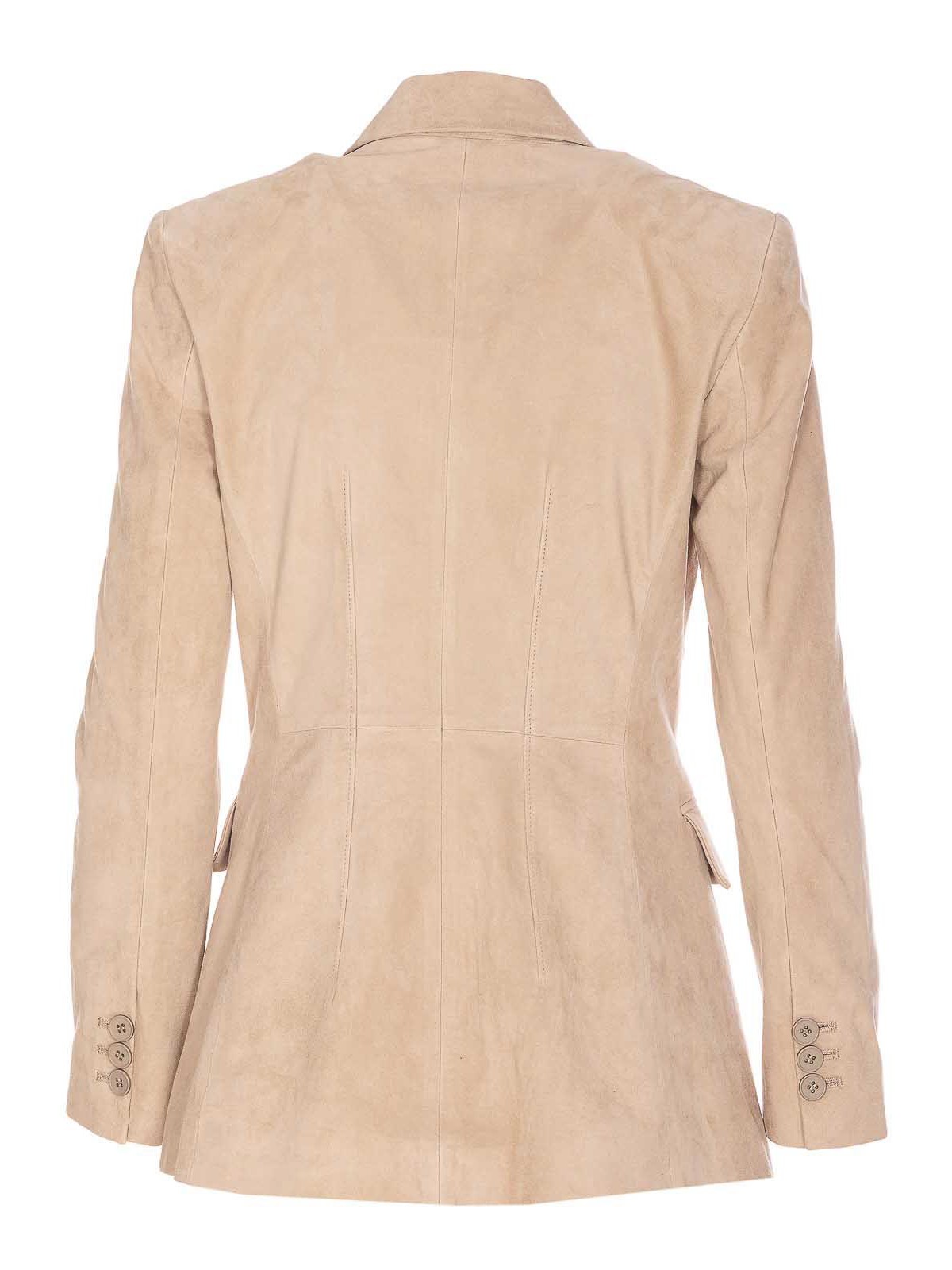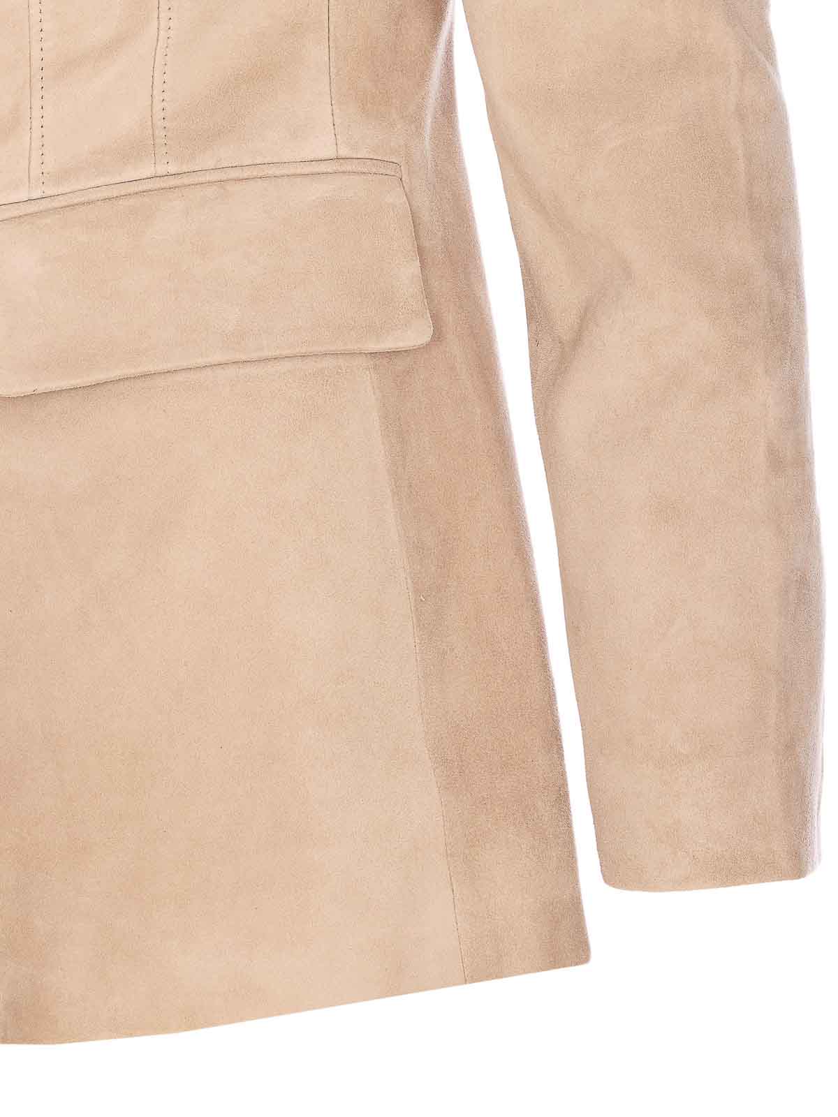 Beigefarbene Jacke mit Knöpfen, V-Ausschnitt, verstärkte Schulter, lange Ärmel, Knöpfe an den Manschetten