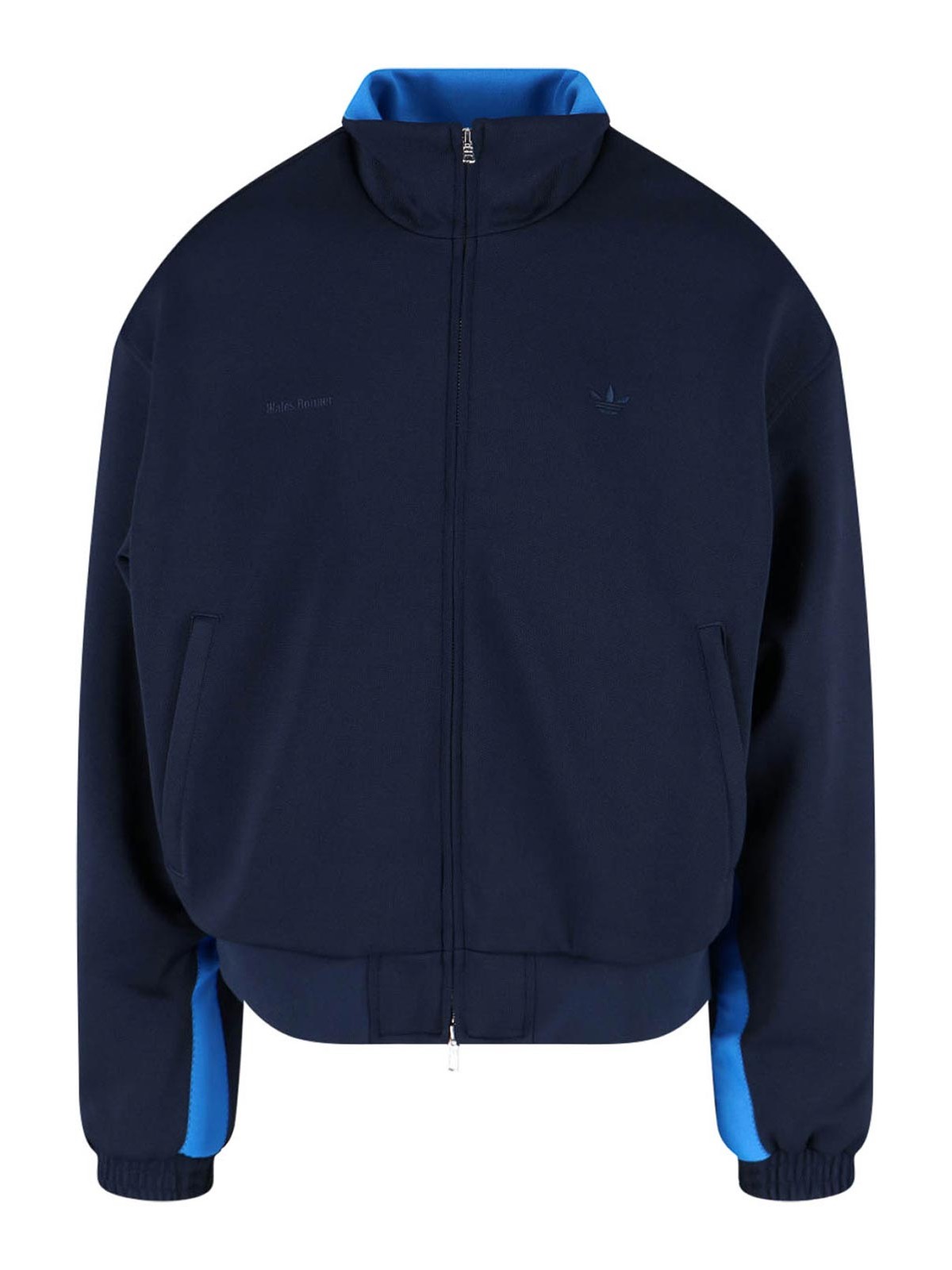 Wales Bonner Logo-Jacke mit Logo-Logo In Blauen Marinetönen mit Stehkragen und doppeltem Reißverschluss, Logo Trefoil, farblich auf der Brust, zwei Seitentaschen, seitlicher Reißverschluss, gerader Rand