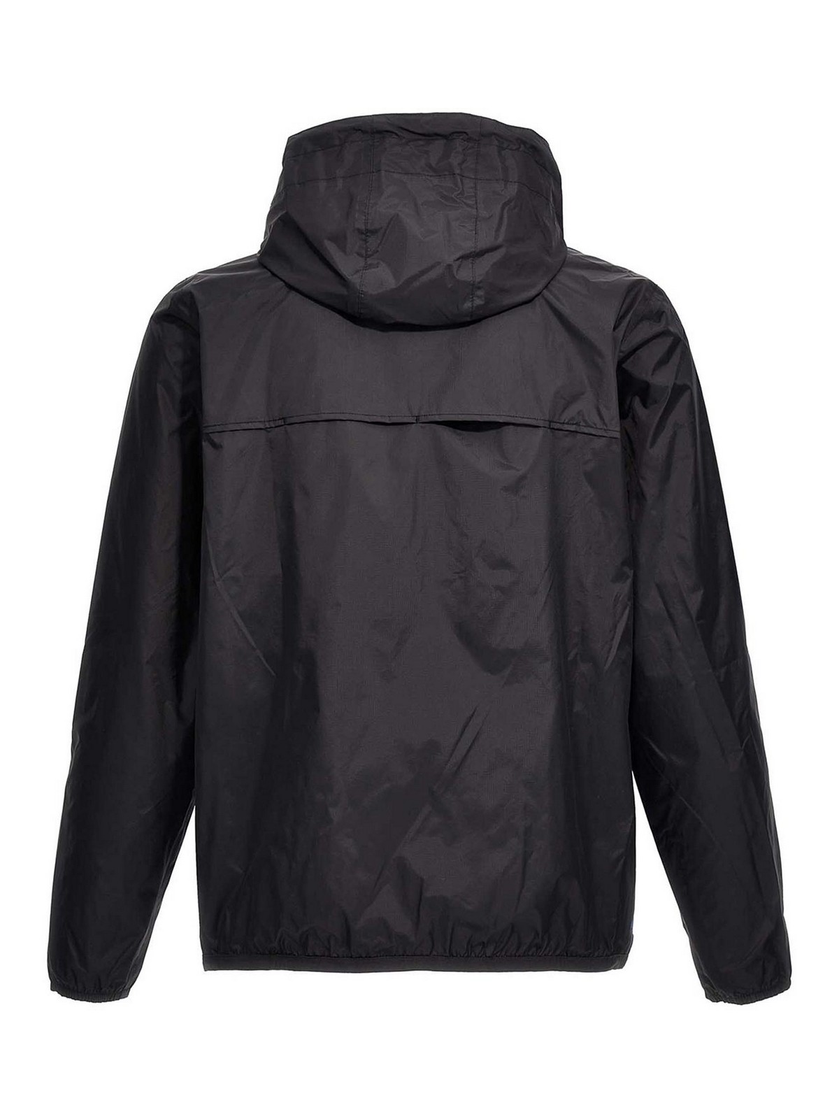 Comme des garons play x k-way wasserdichte Kapuzenjacke mit Frontpatch und Logo-Print, rückseitigem Logo-Print, Taschen, elastischen Ärmelabschlüssen, Reißverschluss, verstellbarem Kordelzug am Saum.