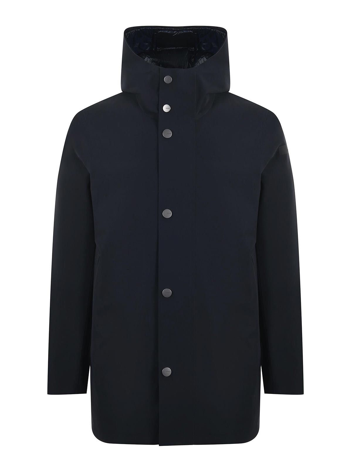 Rote Jacke aus elastischem Nylon. dunkelblau. gefüttert mit Gänsedaunensteppung. Kapuze. Wasser- und winddicht. Fronttaschen. Reißverschluss und Druckknopfverschluss. Logo-Etikett am Ärmel. Abgebildete Größe: 50 Obermaterial: 80% Polyamid, 20% Elastan Füllung: 90% Daunen, 10% Federn