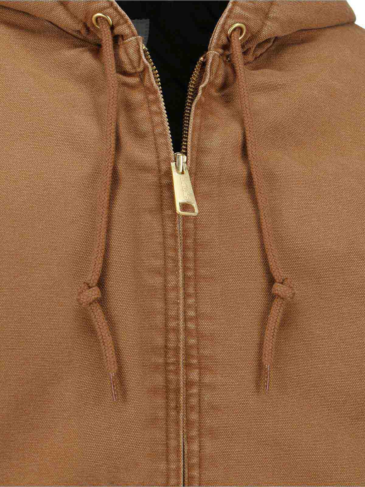 Carhartt Wip og Active-Jacke aus brauner Bio-Baumwolle, Kapuze mit Kordelzug, doppelter Reißverschluss, zwei Fronttaschen, kontrastierender Logo-Patch auf der Vorderseite, kontrastierende Rippabschlüsse, gerader Saum.