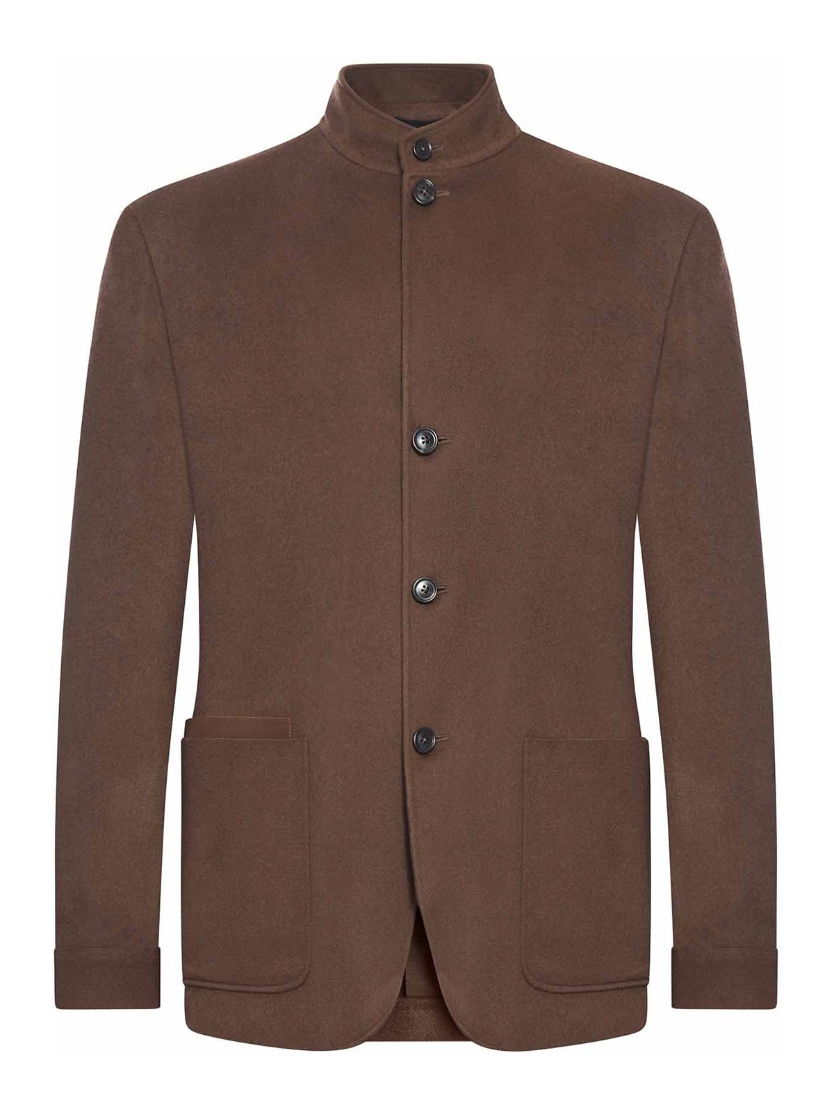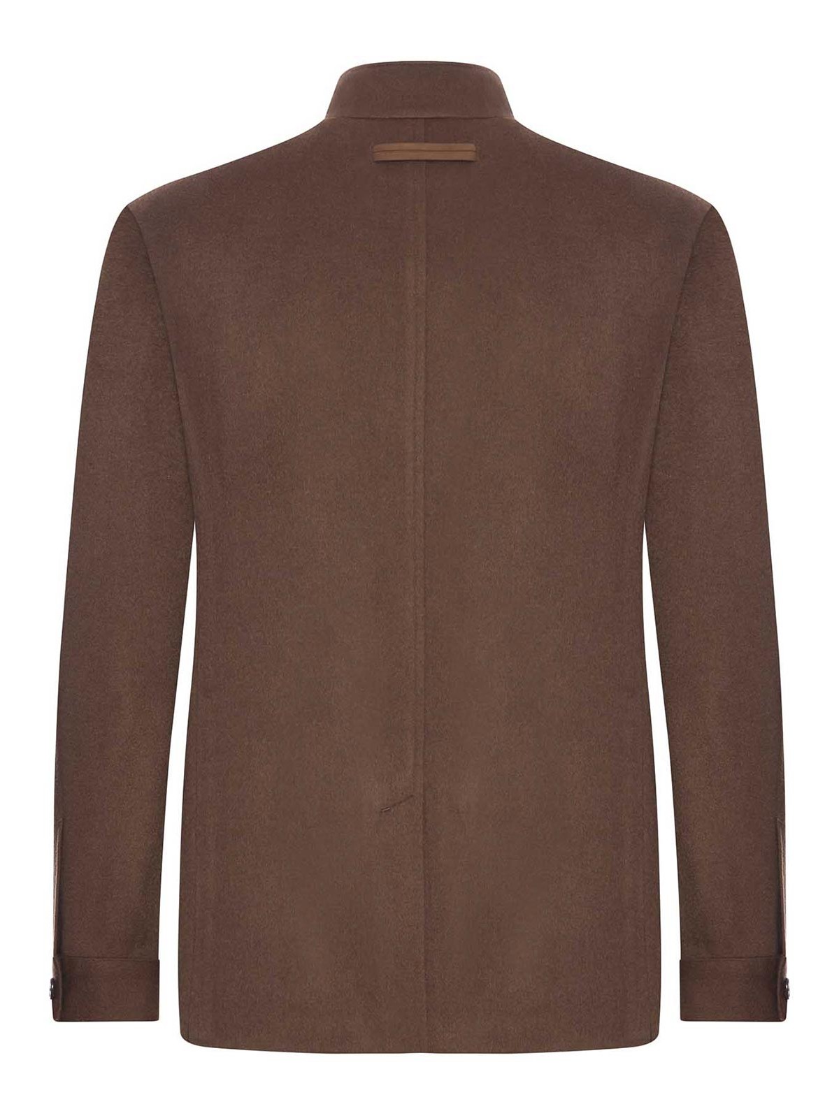 Taillierte Chore-Jacke, einzelner Belüftungsschlitz, Stehkragen, Knopf, Zegna Street-Logo auf der Rückseite, Tasche, aufgesetzte Taschen, unstrukturierte und geklebte Konstruktion, halb, gefüttert, braun