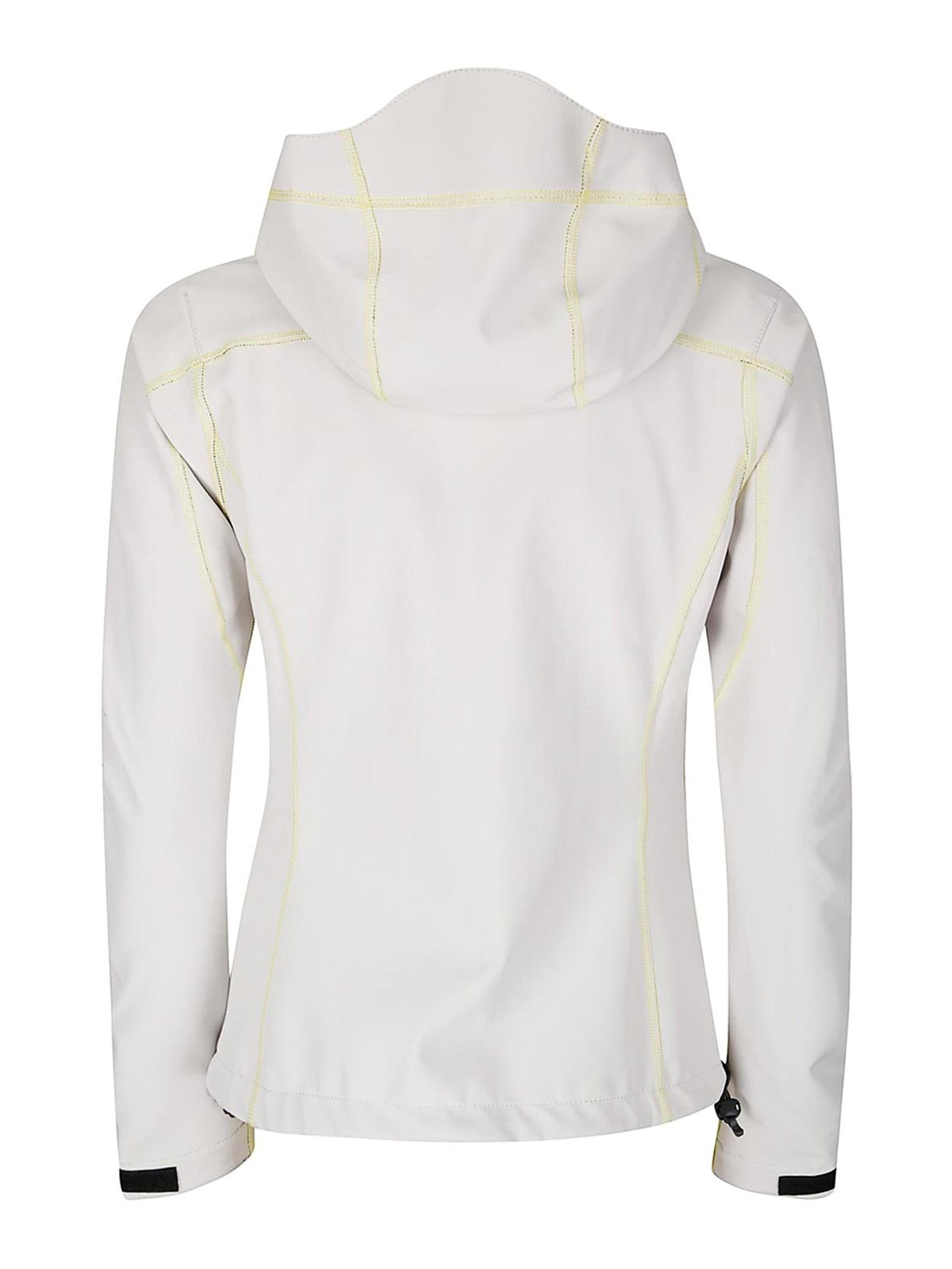 Jacke aus technischem Material, geeignet für raue Klimazonen, Reißverschluss, Kapuze, kontrastierende Stickerei.