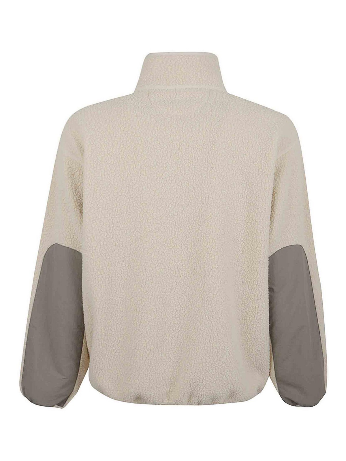 cremefarbene Jacke, Reißverschluss, Brusttasche, hoher Kragen, lange Ärmel, gerader Saum