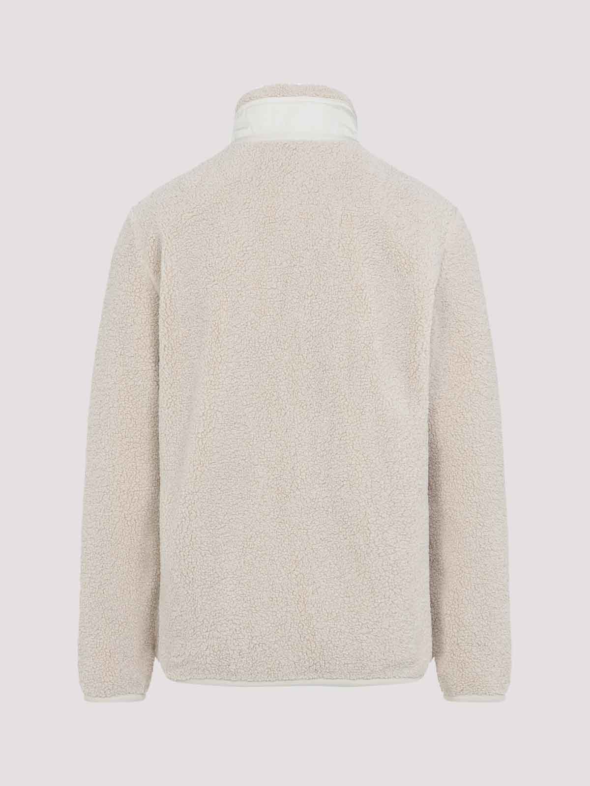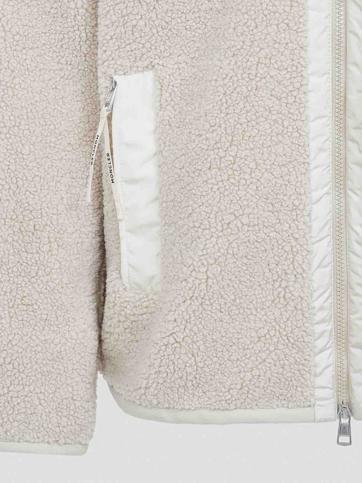 Moncler hellbeige Jacke mit Reißverschluss, gefertigt aus beigem Teddy, hellbeige, mit Stehkragen, 2-Wege-Reißverschluss, Pattentasche mit Logo-Patch auf der Brust, zwei Reißverschlusstaschen an den langen Ärmeln, gerader Saum