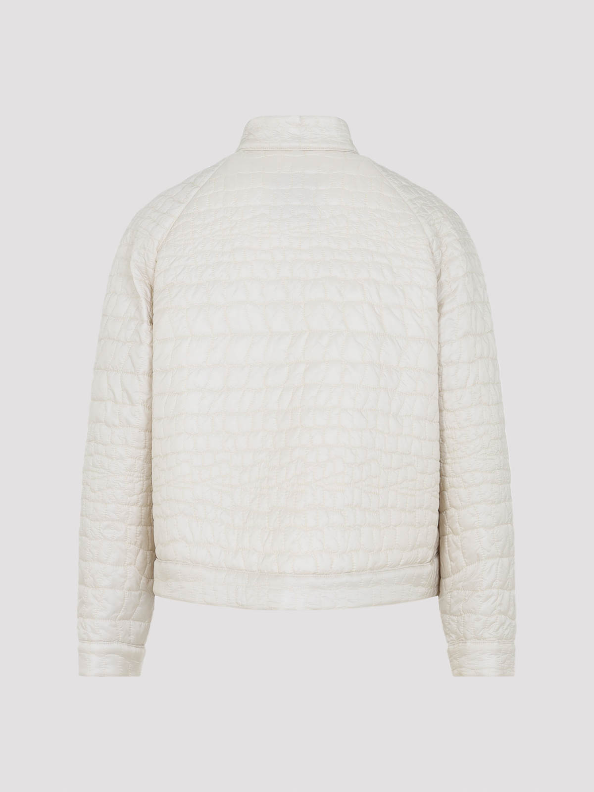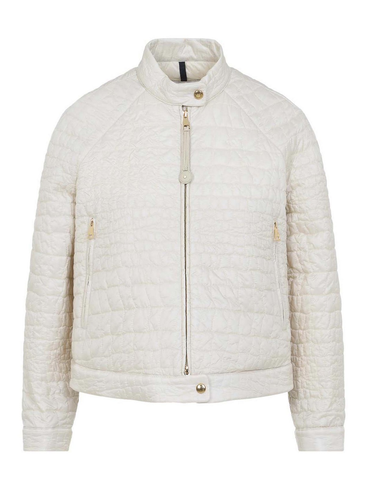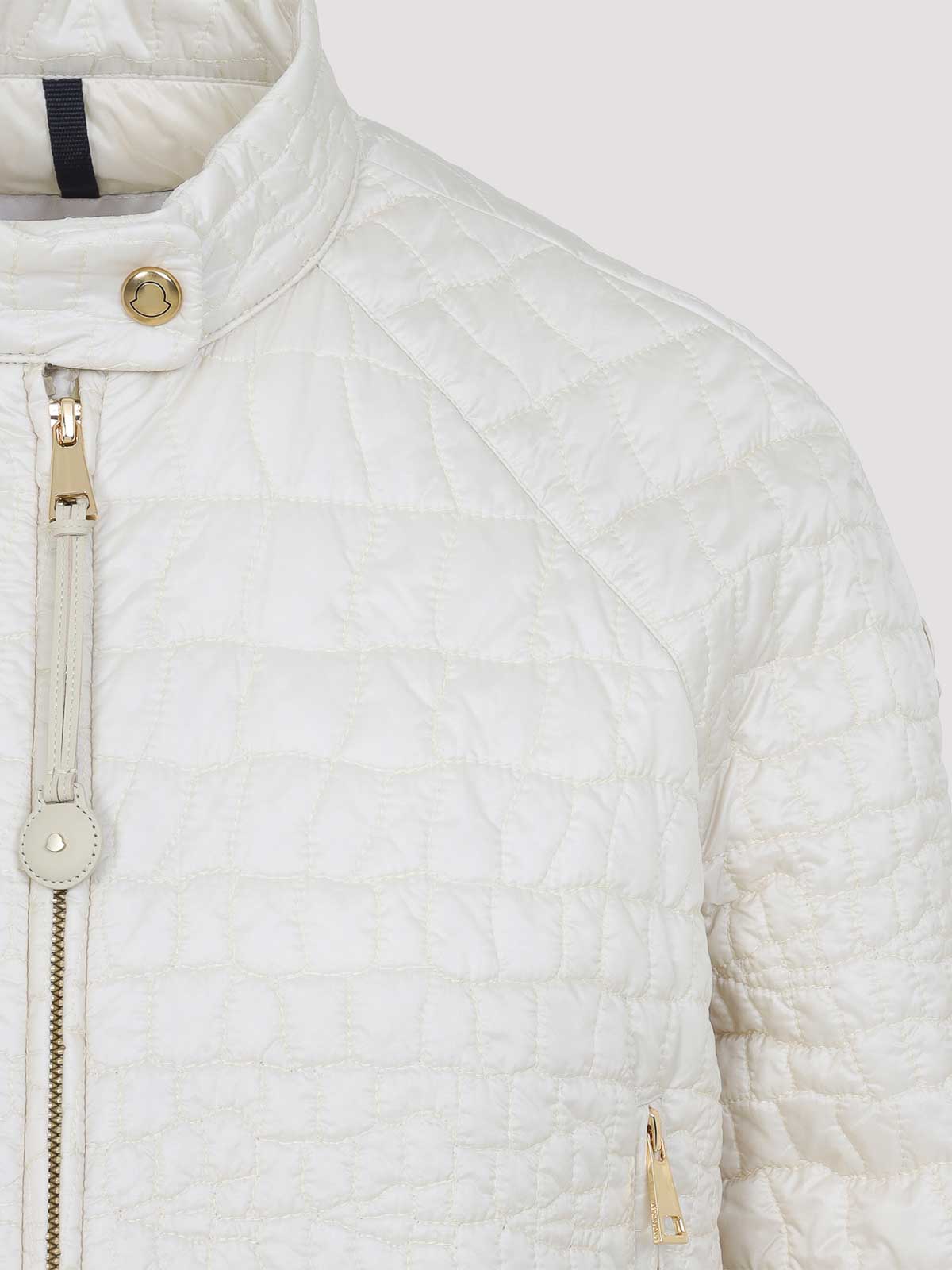 Hellbeige Aubrieta-Jacke von Moncler. Reines hellbeiges Polyamidgewebe. Stehkragen mit Knopfverschluss, Reißverschluss auf der Vorderseite, Seitentaschen mit Reißverschluss, lange Ärmel, geknöpfte Manschetten, Knopfdetail am Saum, gerader Saum, gepolstertes Design.