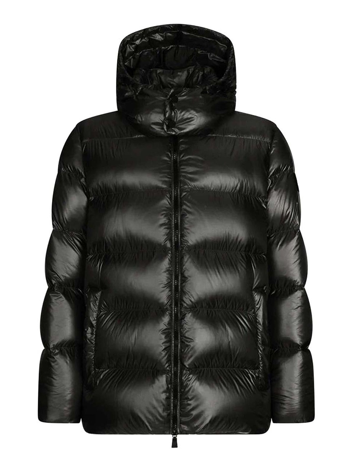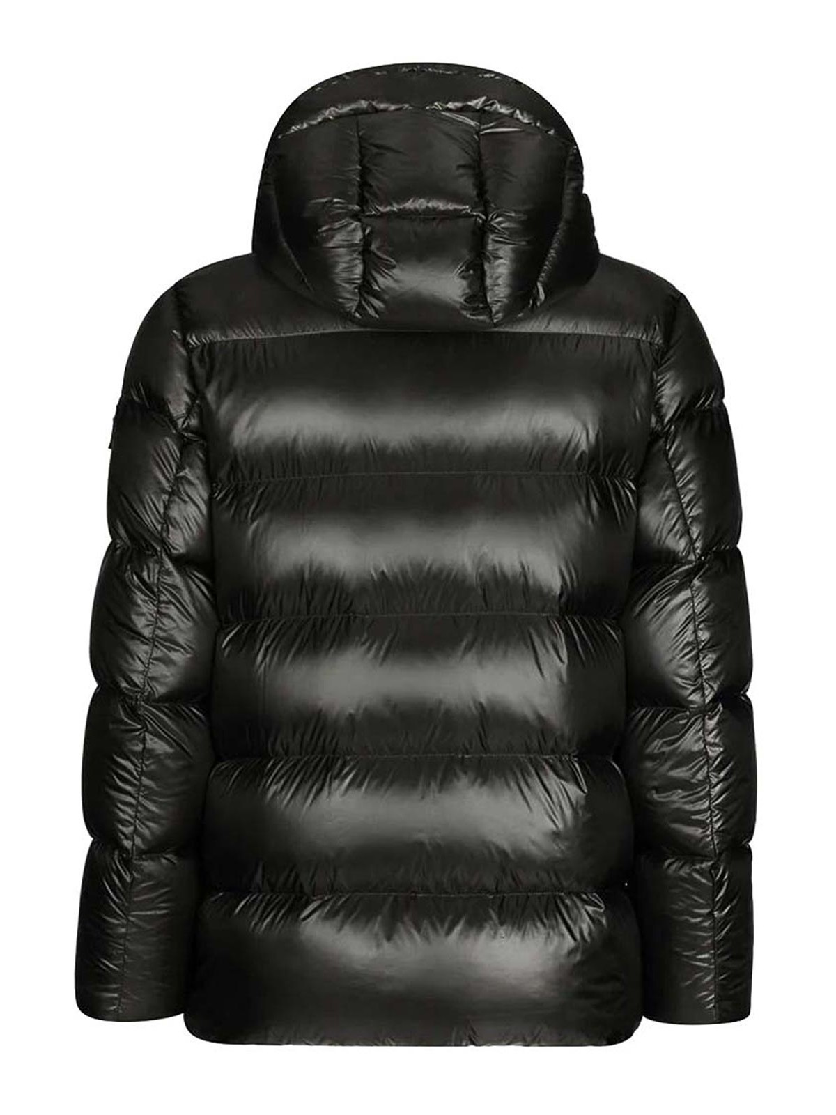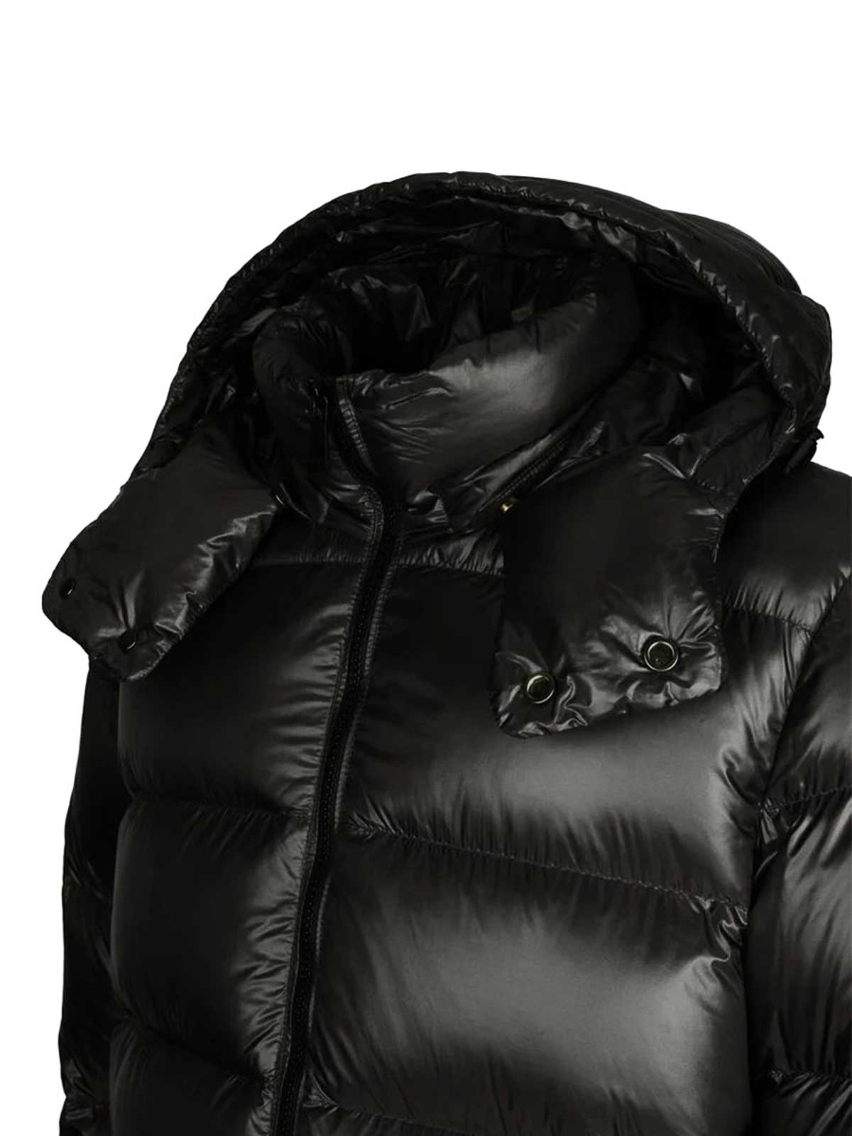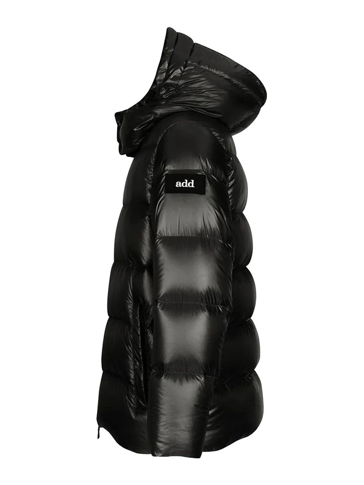 Glänzende schwarze Jacke von add mit doppeltem Schieberreißverschluss auf der Vorderseite, zwei Seitentaschen mit Leiste und Druckknopf, abnehmbarer und verstellbarer Kapuze mit elastischem Kordelzug, zwei Maxi-Innentaschen an der Unterseite, Taschen mit Mikrofleece-Handwärmern