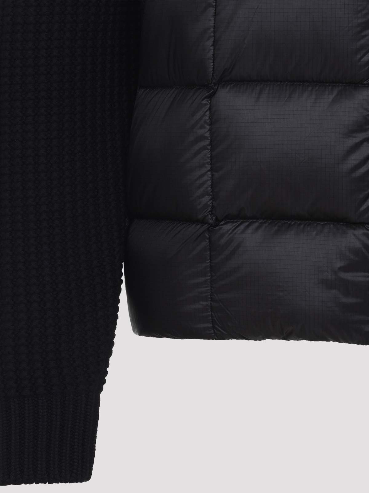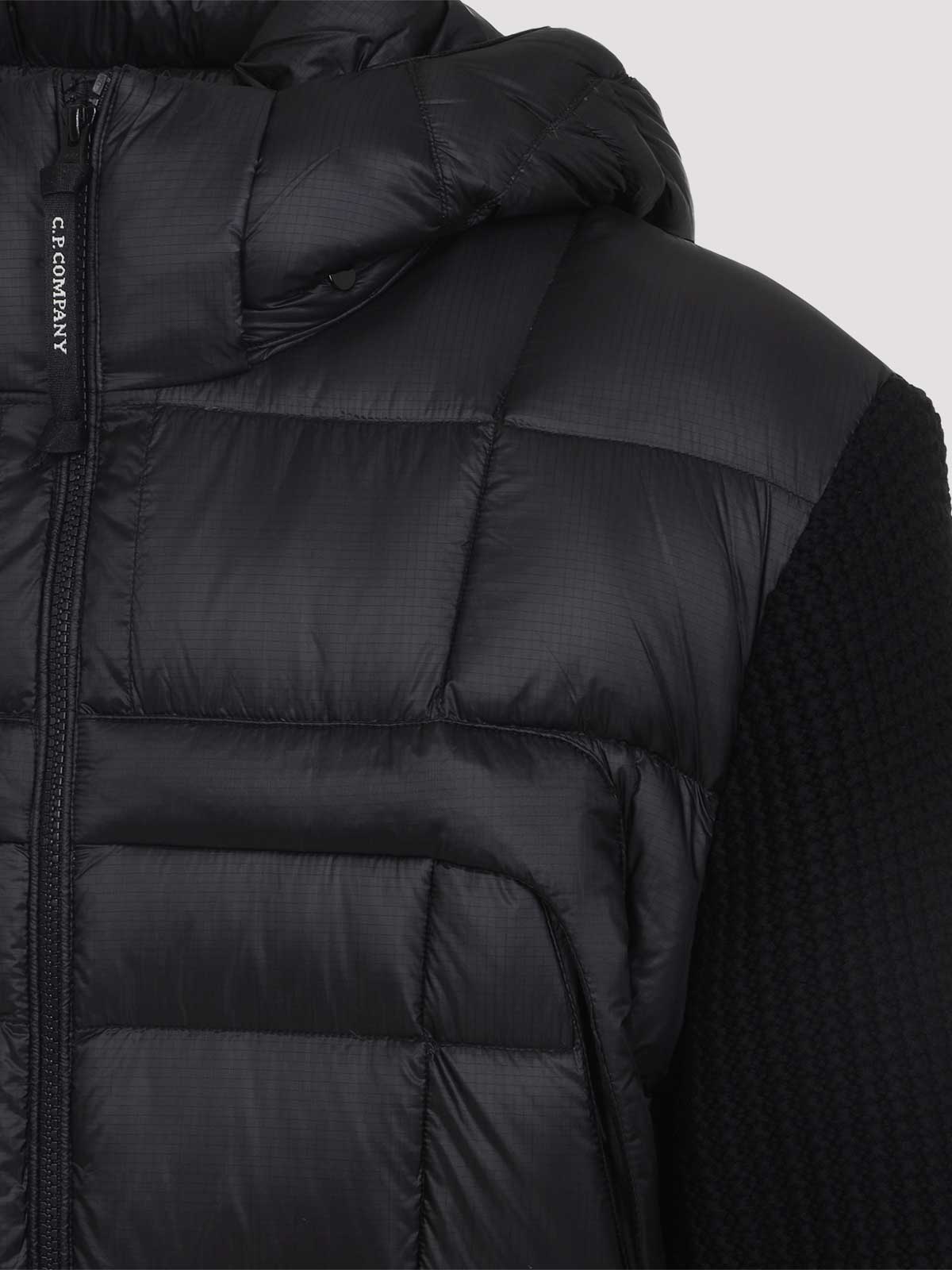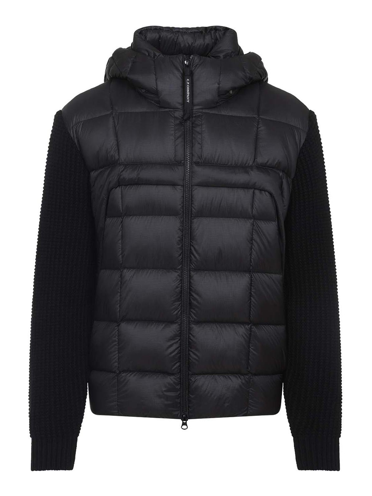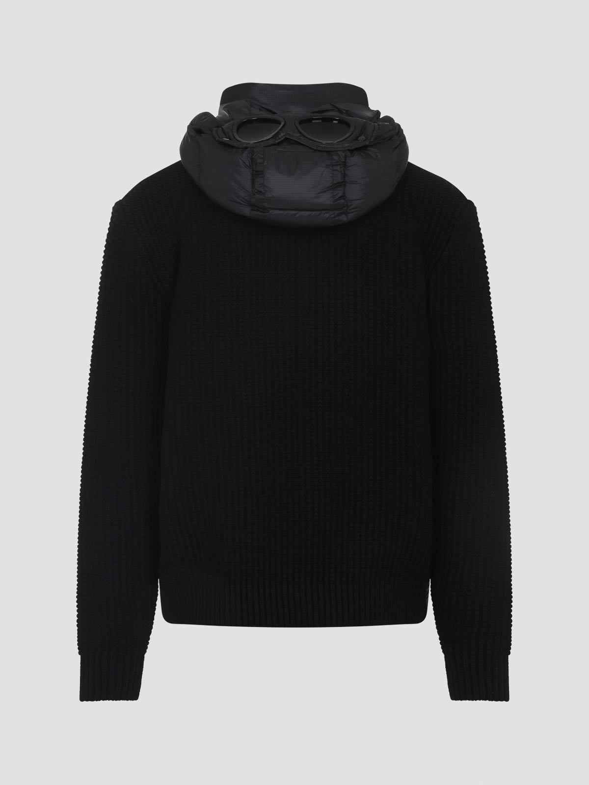 Cp Company schwarze Strickjacke, farblich gepolsterte Kapuze, Stehkragen, Stehkragen, Seitentaschen mit Reißverschluss, tonale lange Ärmel, gerippte Bündchen, gerader Saum