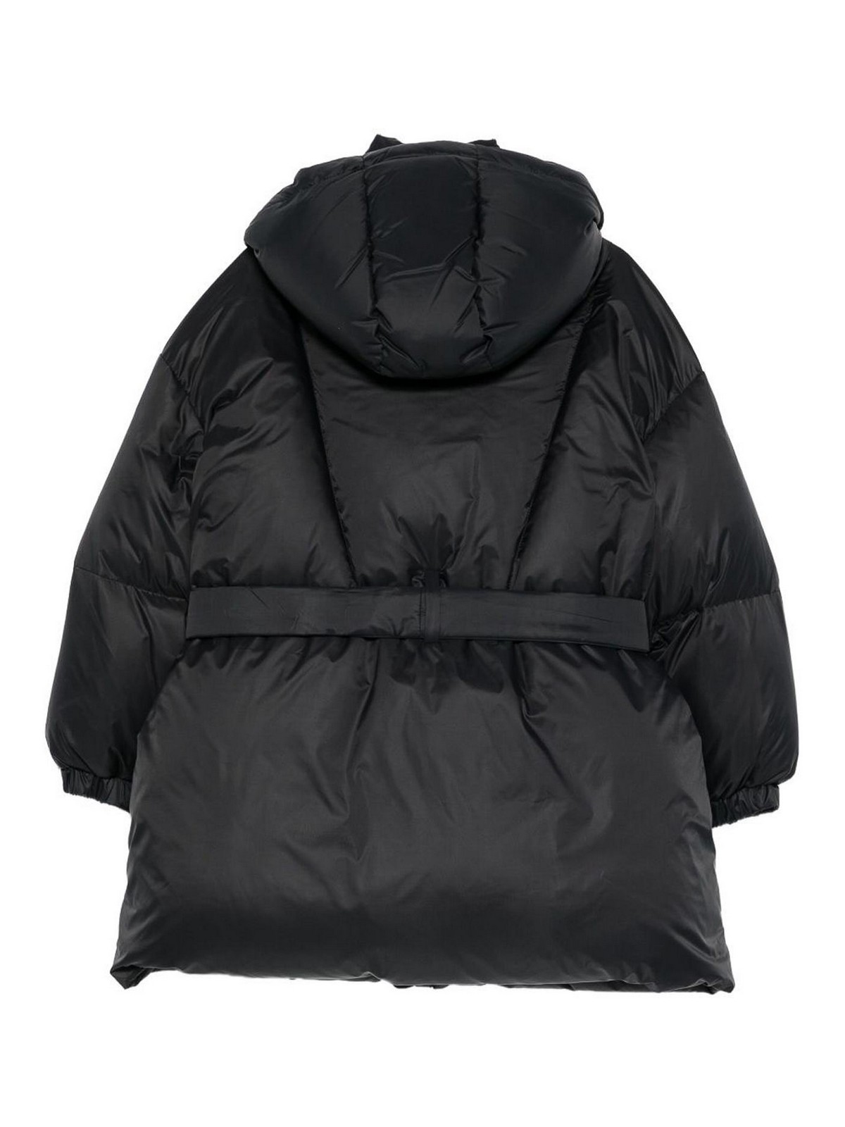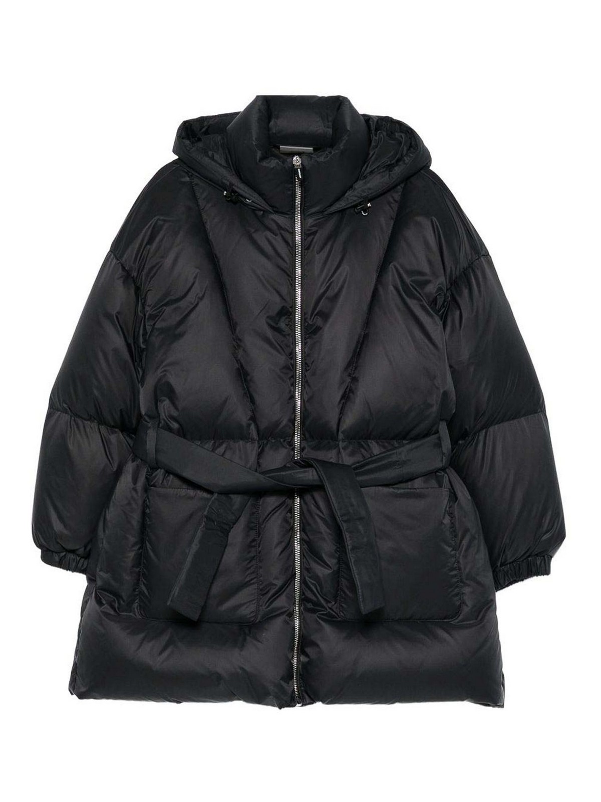 Die Kapuzenjacke hat schwarze aufgesetzte Taschen mit Reißverschluss und Gürtel an der Taille