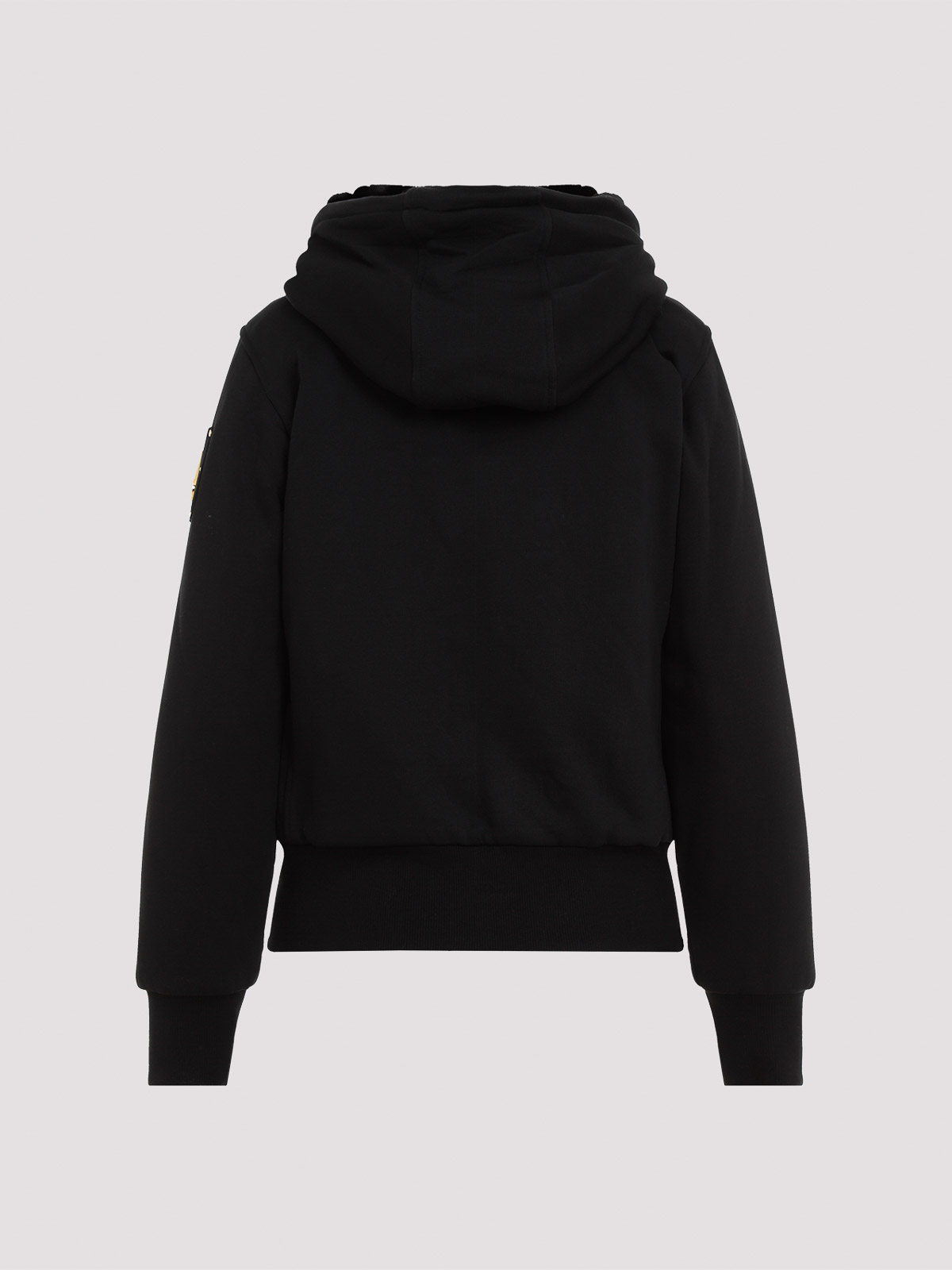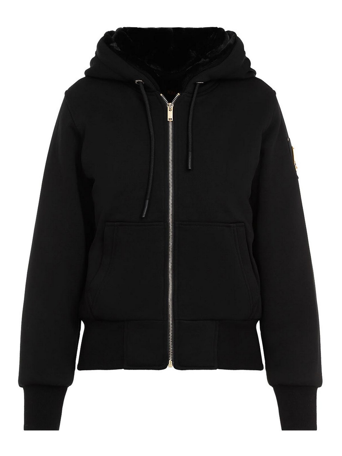 Schwarze Madison Bunny-Jacke von Moose Knuckles, gefertigt und gemischt, farblich abgestimmte Kapuze, Kordelzug, Seitentaschen, aufgesetztes Logo auf der rechten Seite, lange Ärmel, gerippte Ärmelbündchen und gerader Saum