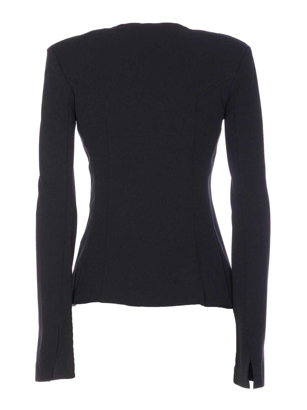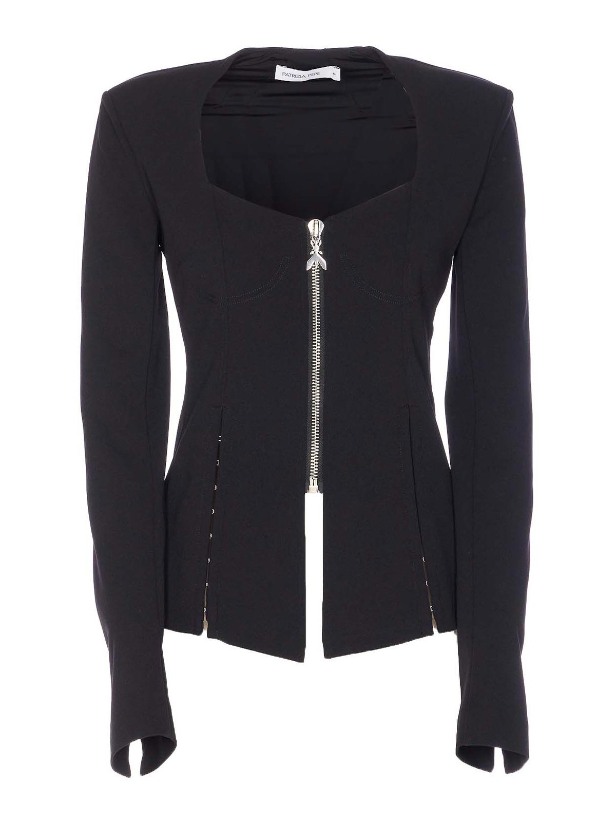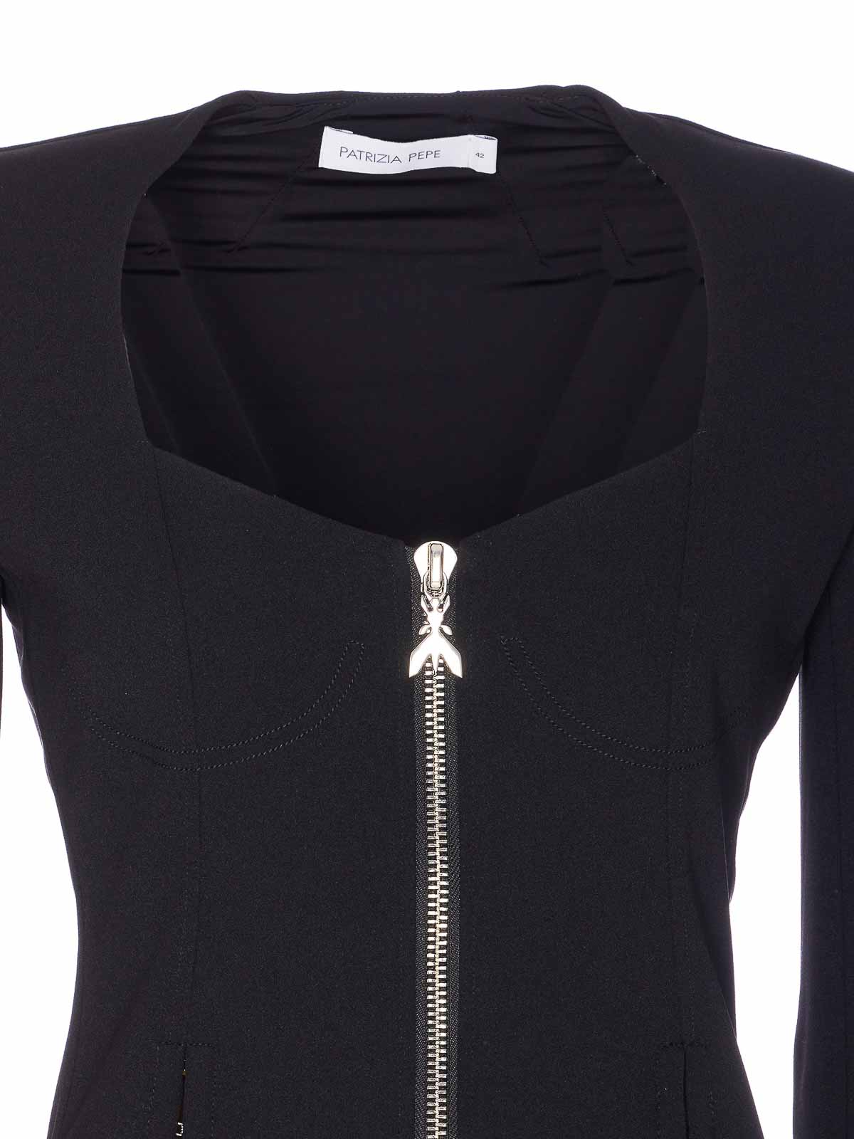 Patrizia Pepe schwarze Jacke mit frontalem Reißverschluss, weitem Halsausschnitt, langen Ärmeln, verstärkte Schulter, Hakendetail an der Seite