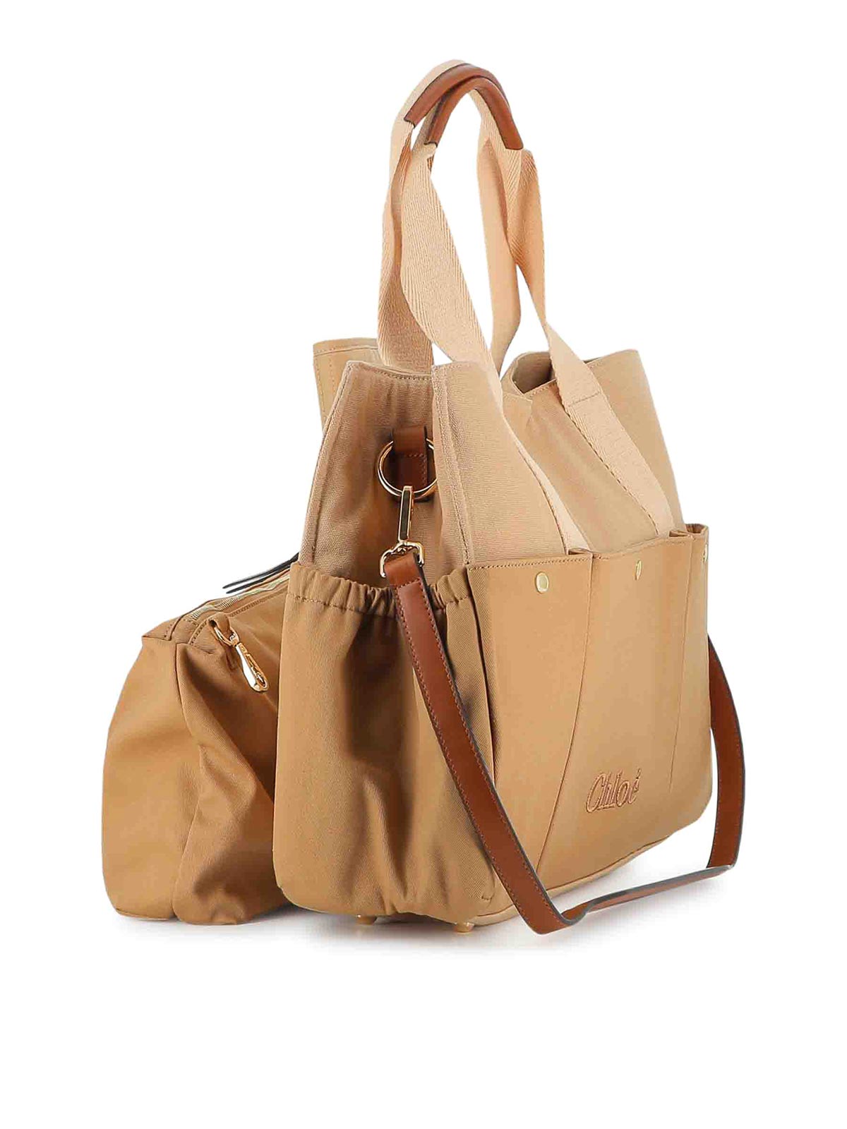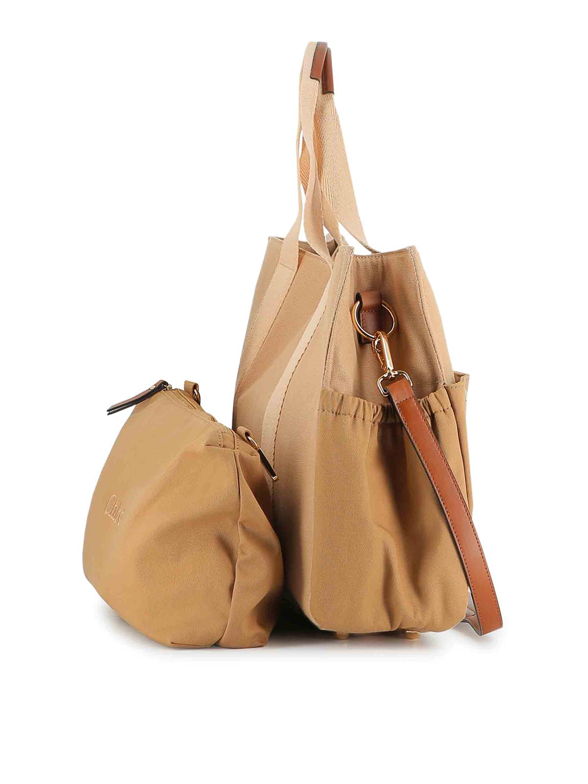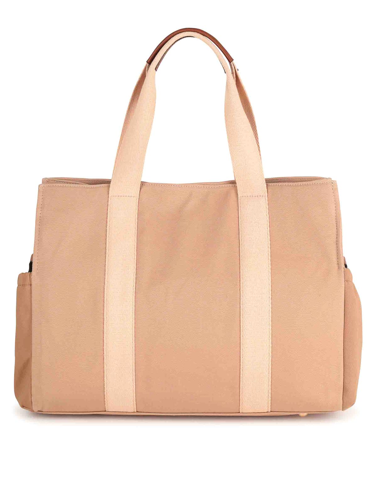 Beigefarbene Außentasche mit zwei Griffen, abnehmbares Logo, Faltenfalte, reine Oberflächen