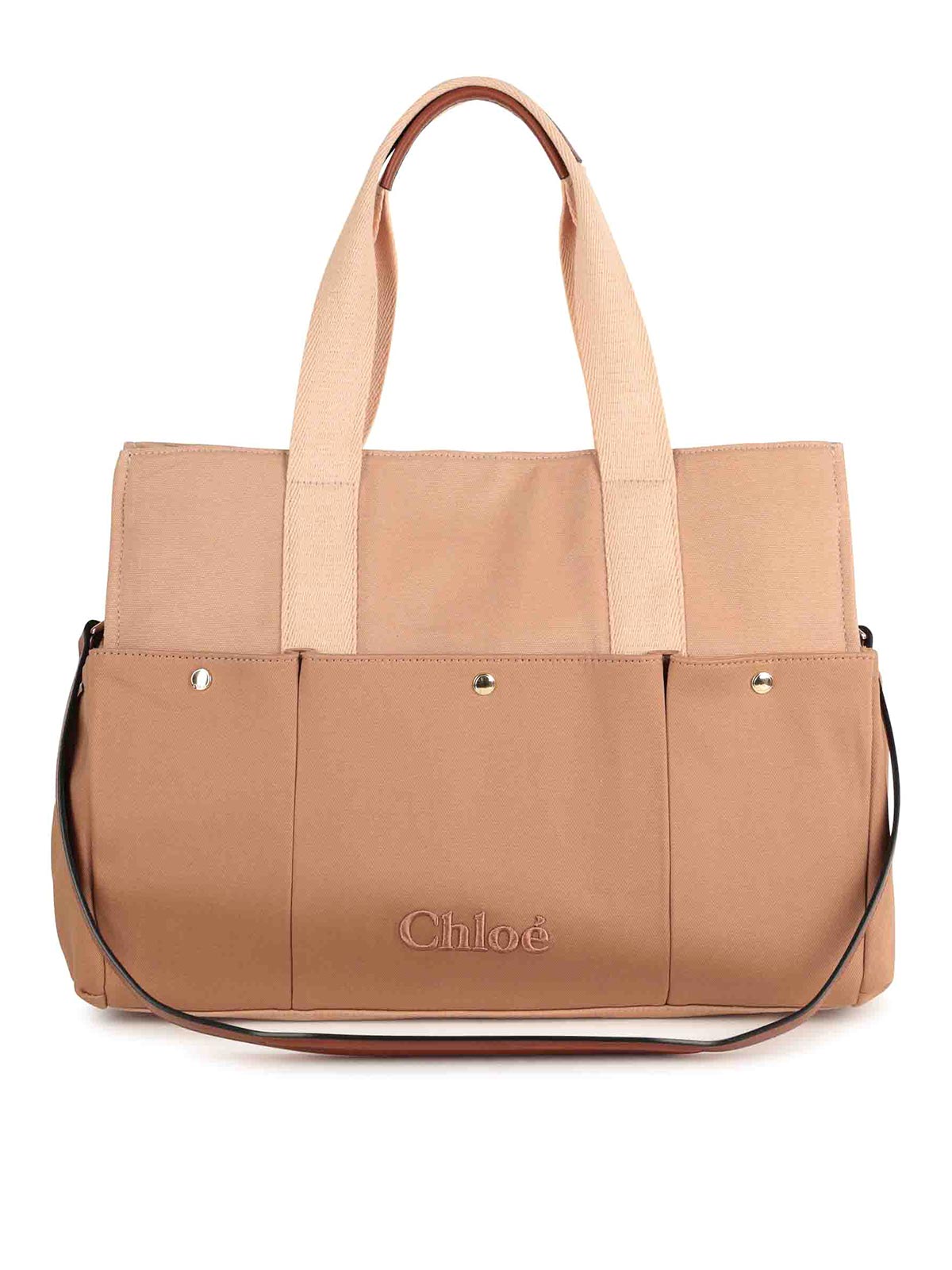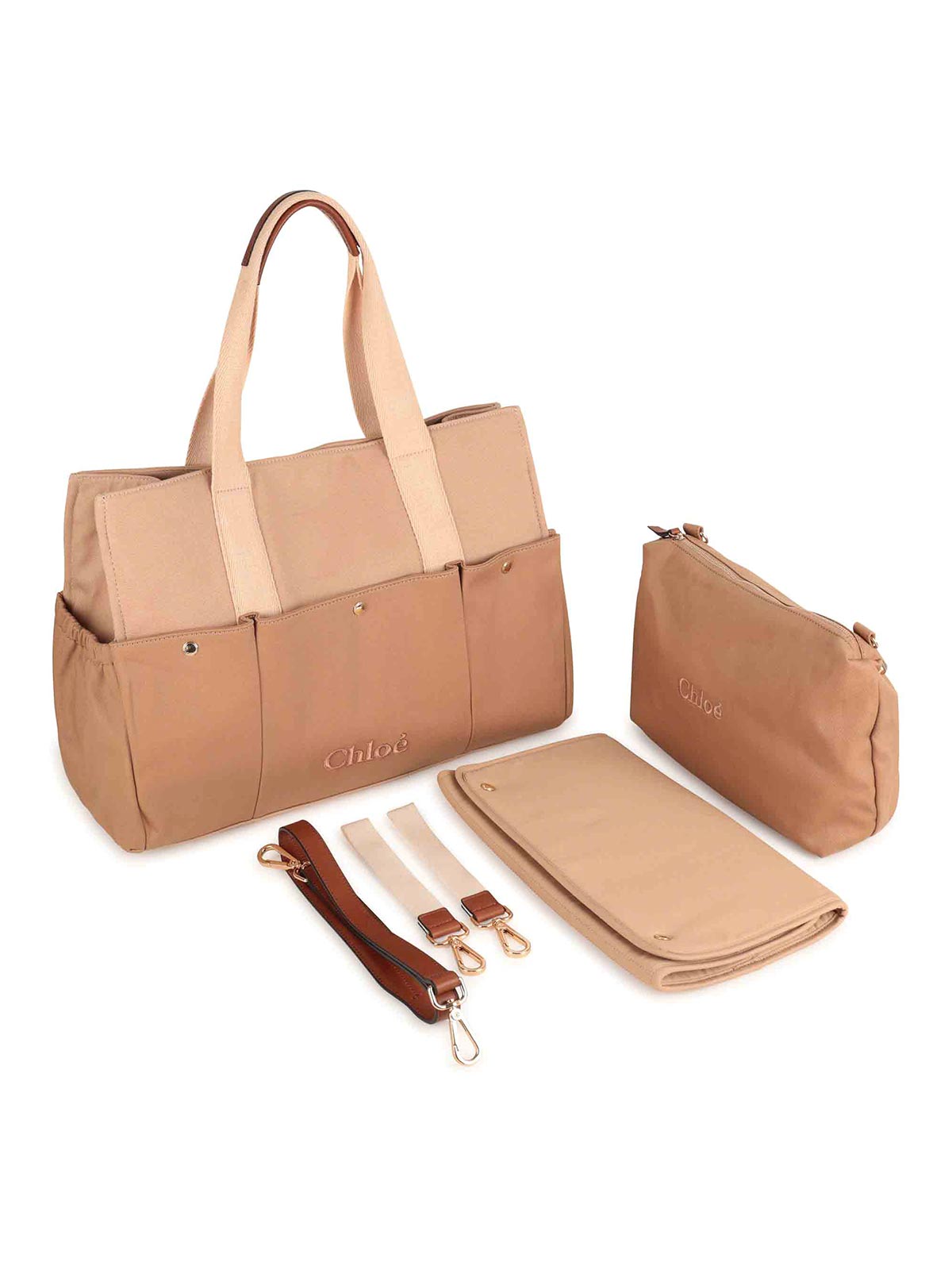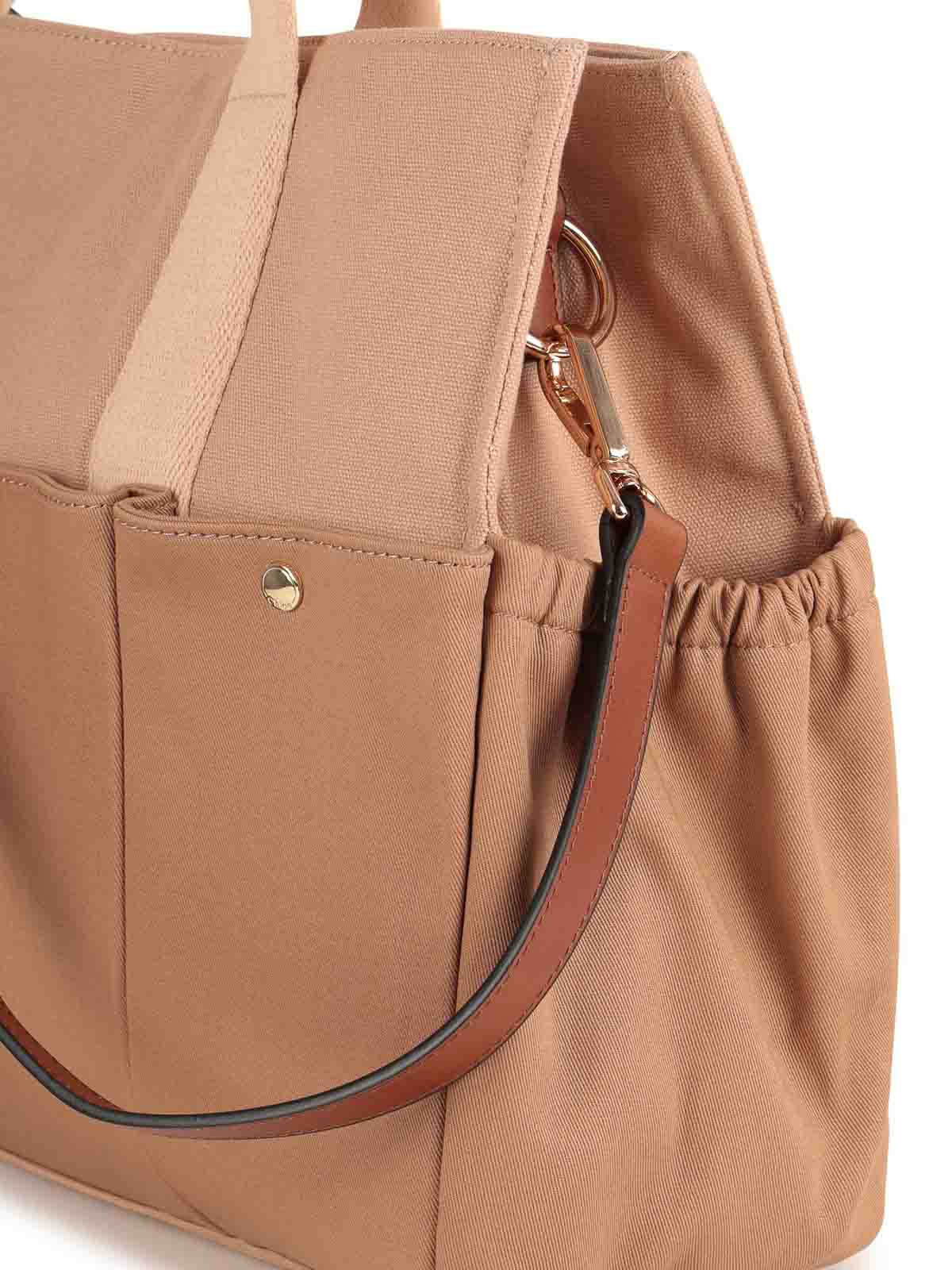 Beigefarbene Außentasche mit zwei Griffen, abnehmbares Logo, Faltenfalte, reine Oberflächen