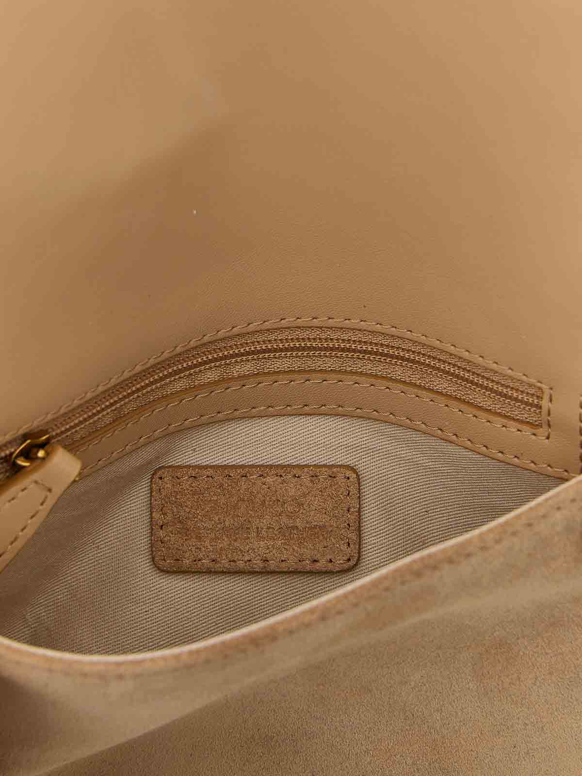 Love Click Soft Horizontal' Mini-Clutch aus Veloursleder mit Ton in Ton in-Ton-Intarsie, flaches Design, rechteckige Form mit Ton-in-Ton-Fransen an den Seiten, magnetischer Klappenverschluss mit Metalllogo „Love Birds Diamond Cut“ auf der Vorderseite, Gesäßtasche, Baumwollbohrfutter, abnehmbarer Schultergurt.