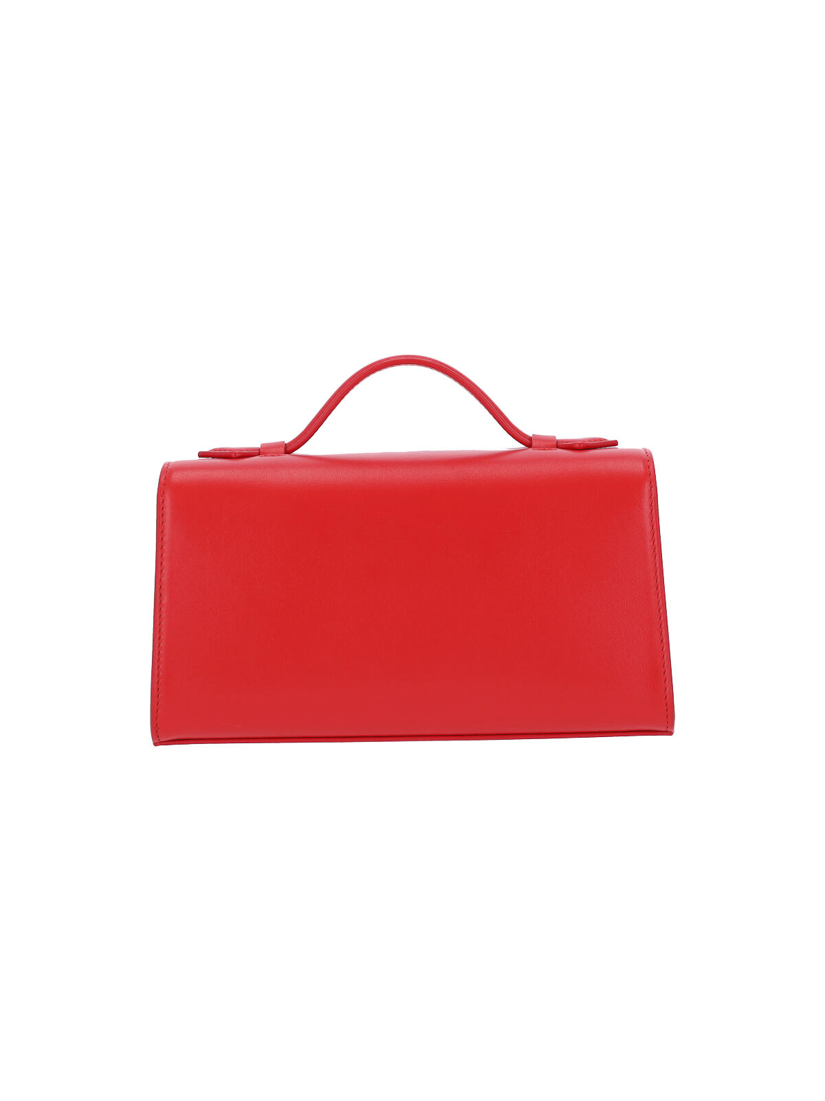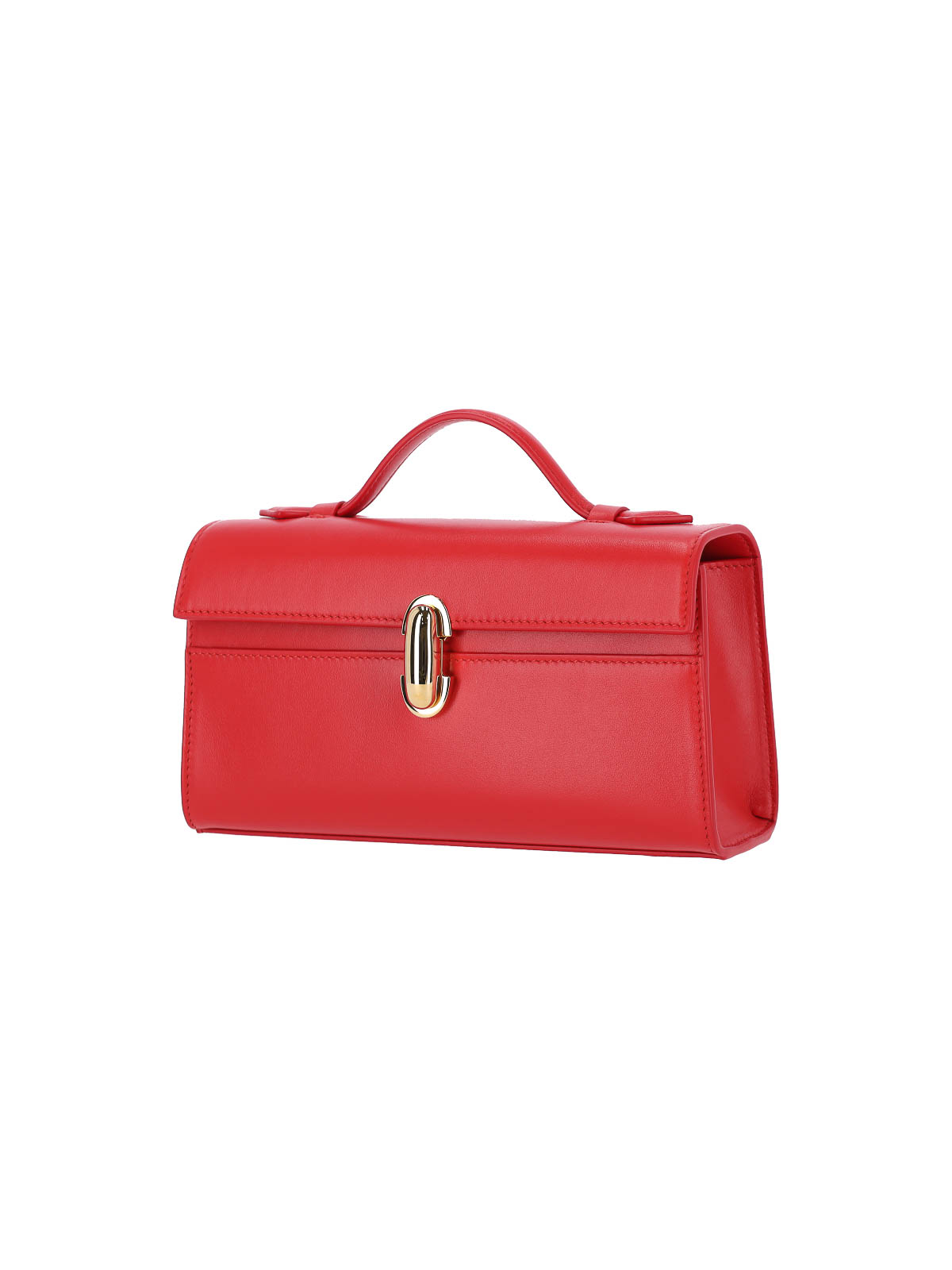 Symmetry Savette Clutch aus rotem Kalbsleder, ein Henkel oben, goldfarbener Metallverschluss auf der Vorderseite, eingeprägtes Logo auf der Innenseite, eine flache Innentasche, ein Hauptfach im Inneren.