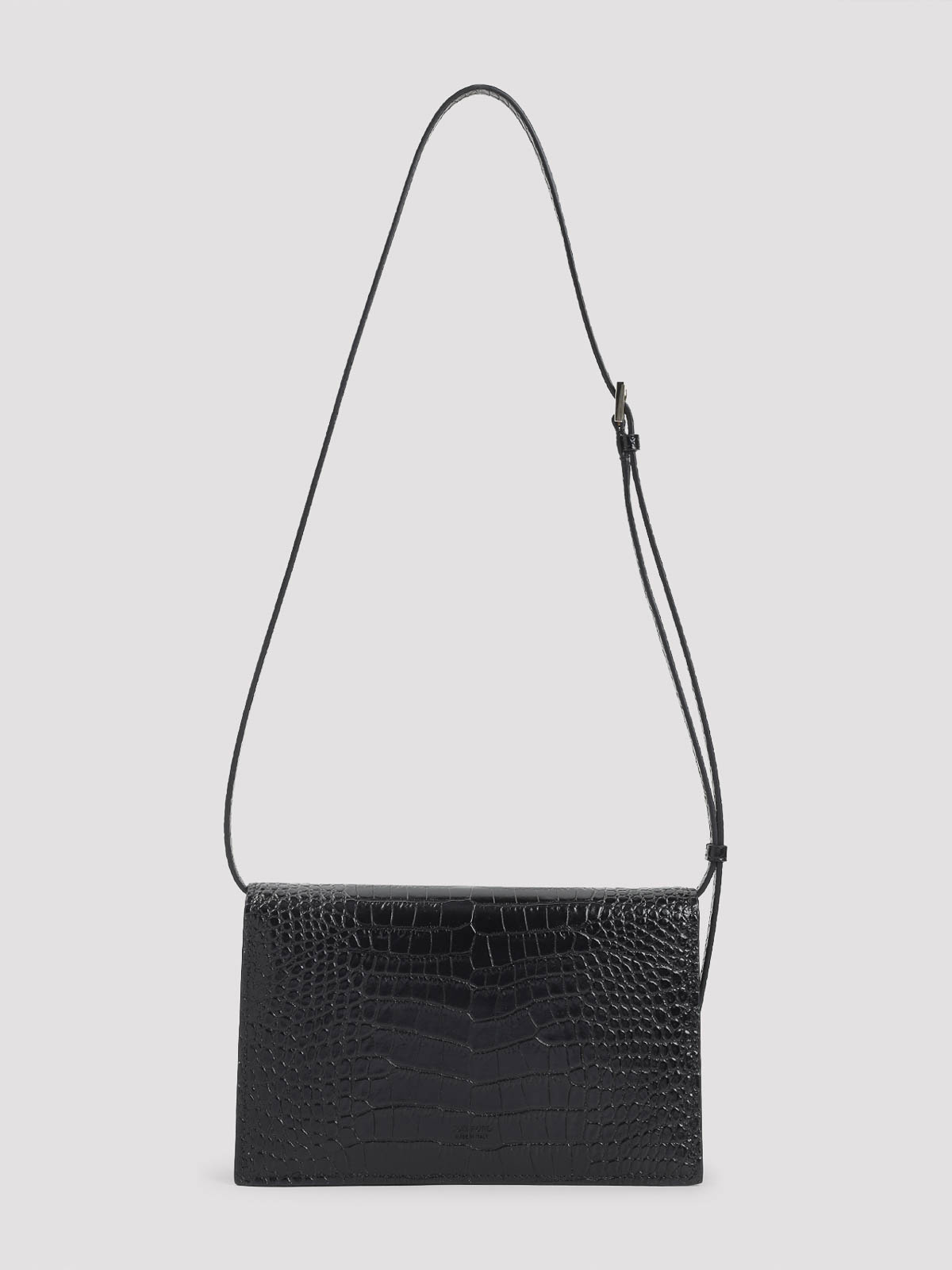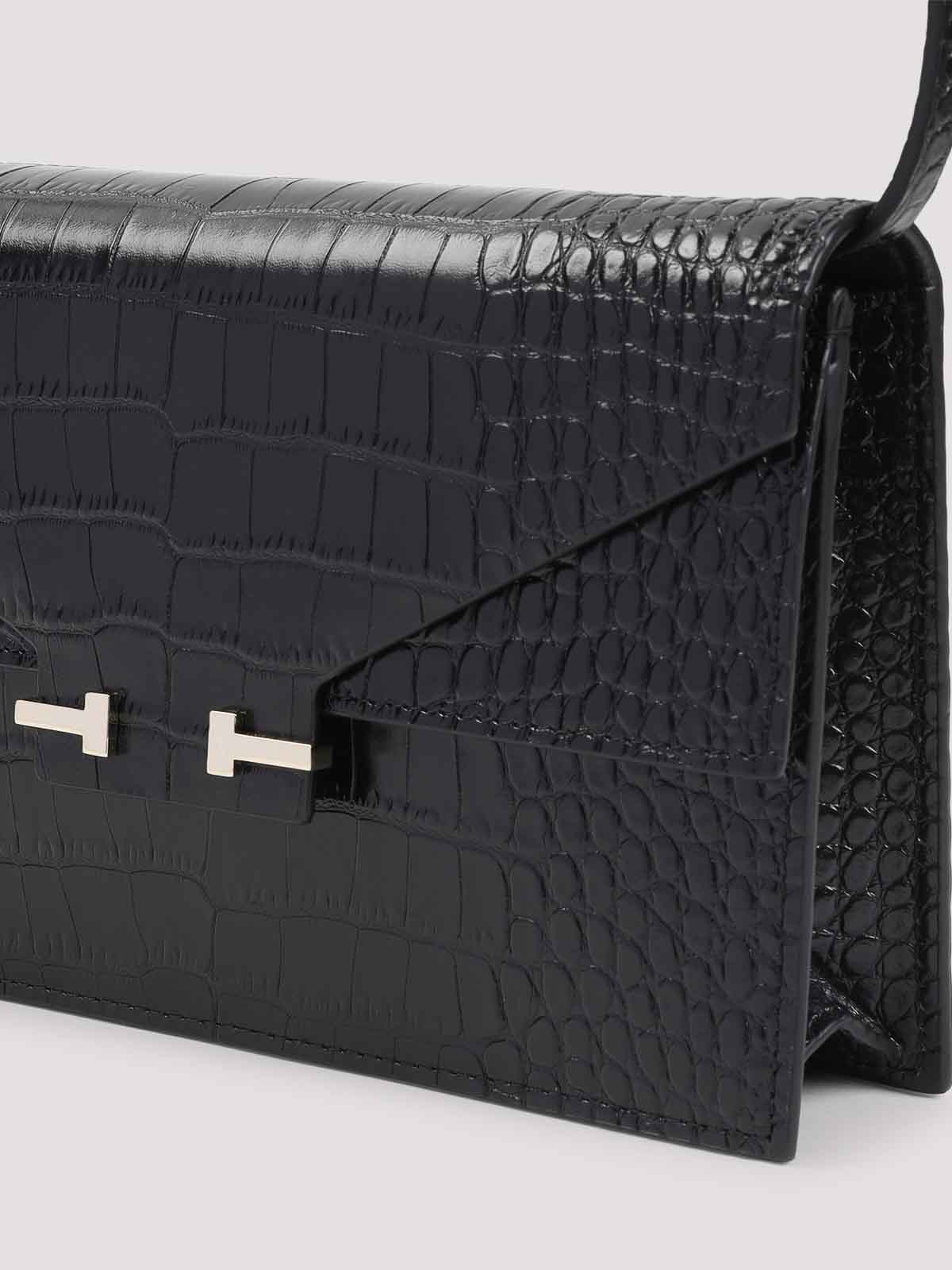 Tom Ford Mini-Tasche aus schwarzem Kalbsleder, weich bedruckt. Tasche aus reinem schwarzem Kalbsleder, verstellbarer Schulterriemen an der Oberseite, automatischer Verschluss mit Frontklappe, silberfarbenes T-Detail mit doppelter Signatur auf der Vorderseite, ein Hauptfach. Silberfarbene Hardware mit Krokodileffekt.