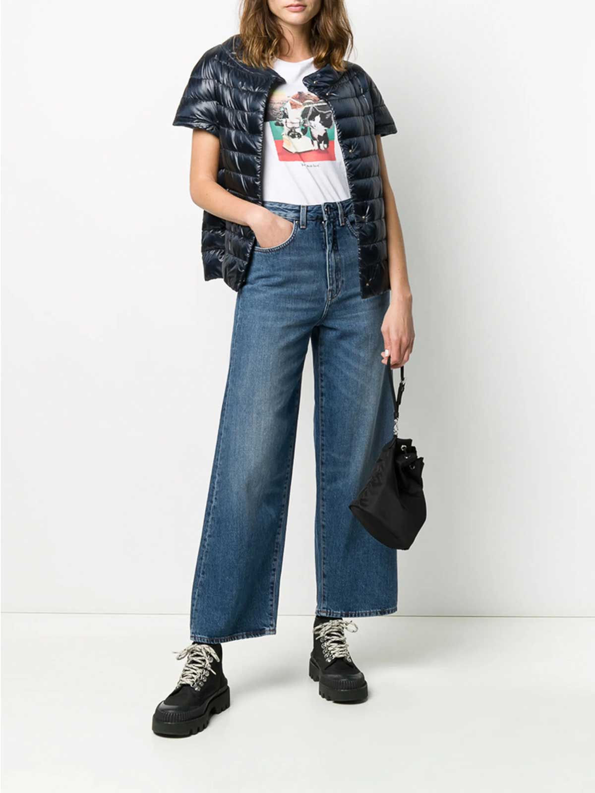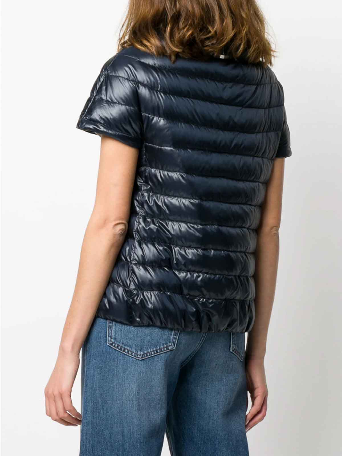 Marineblaue, tolle Daunenjacke mit kurzen Ärmeln von Herno mit Stehkragen, Knopfverschluss auf der Vorderseite, Seitentaschen und geradem Saum.