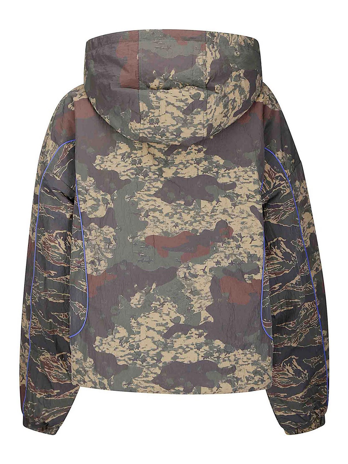 Daunenjacke mit zerknitterter Nylonkapuze, zwei Fronttaschen mit Reißverschluss, Tarnmuster, kontrastierenden Nähten.
