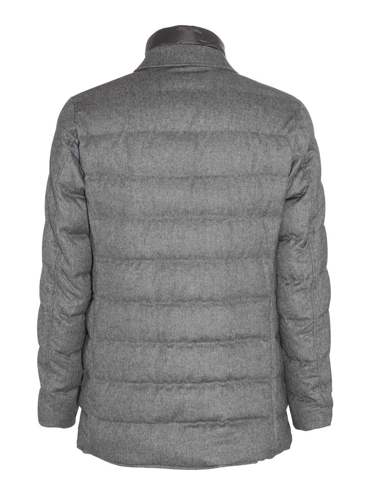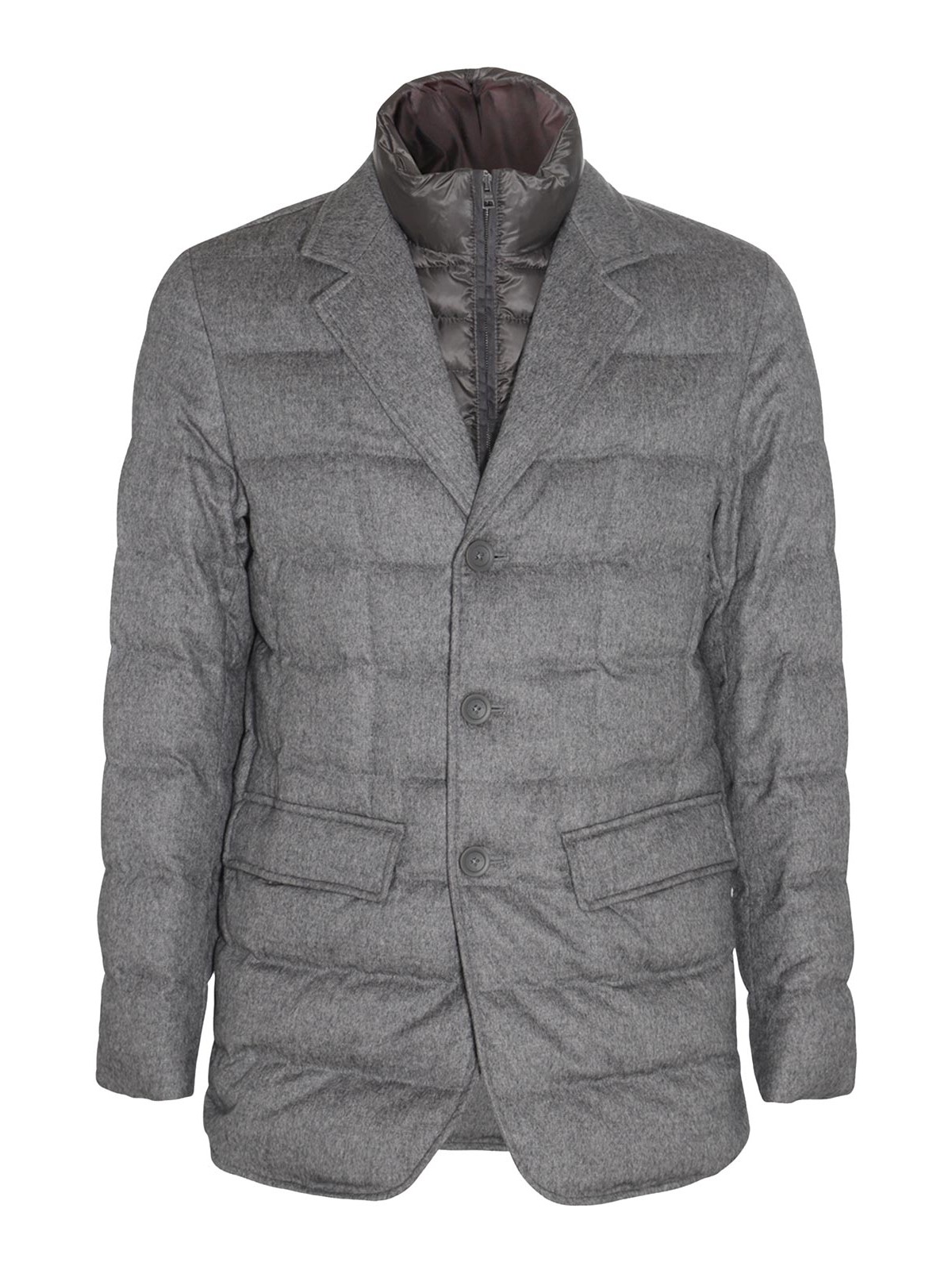 Graue, gepolsterte Jacke von Herno mit folgenden Eigenschaften: lange Ärmel, paspelierte Taschen, einreihiger Knopf, klassischer Revers und Stehkragen mit Reißverschluss.