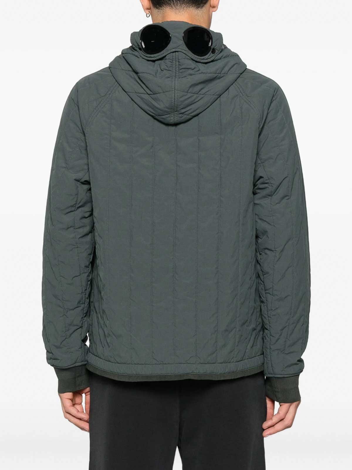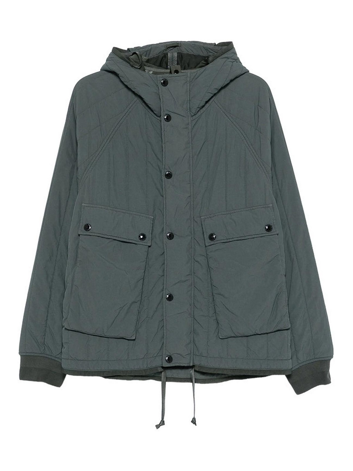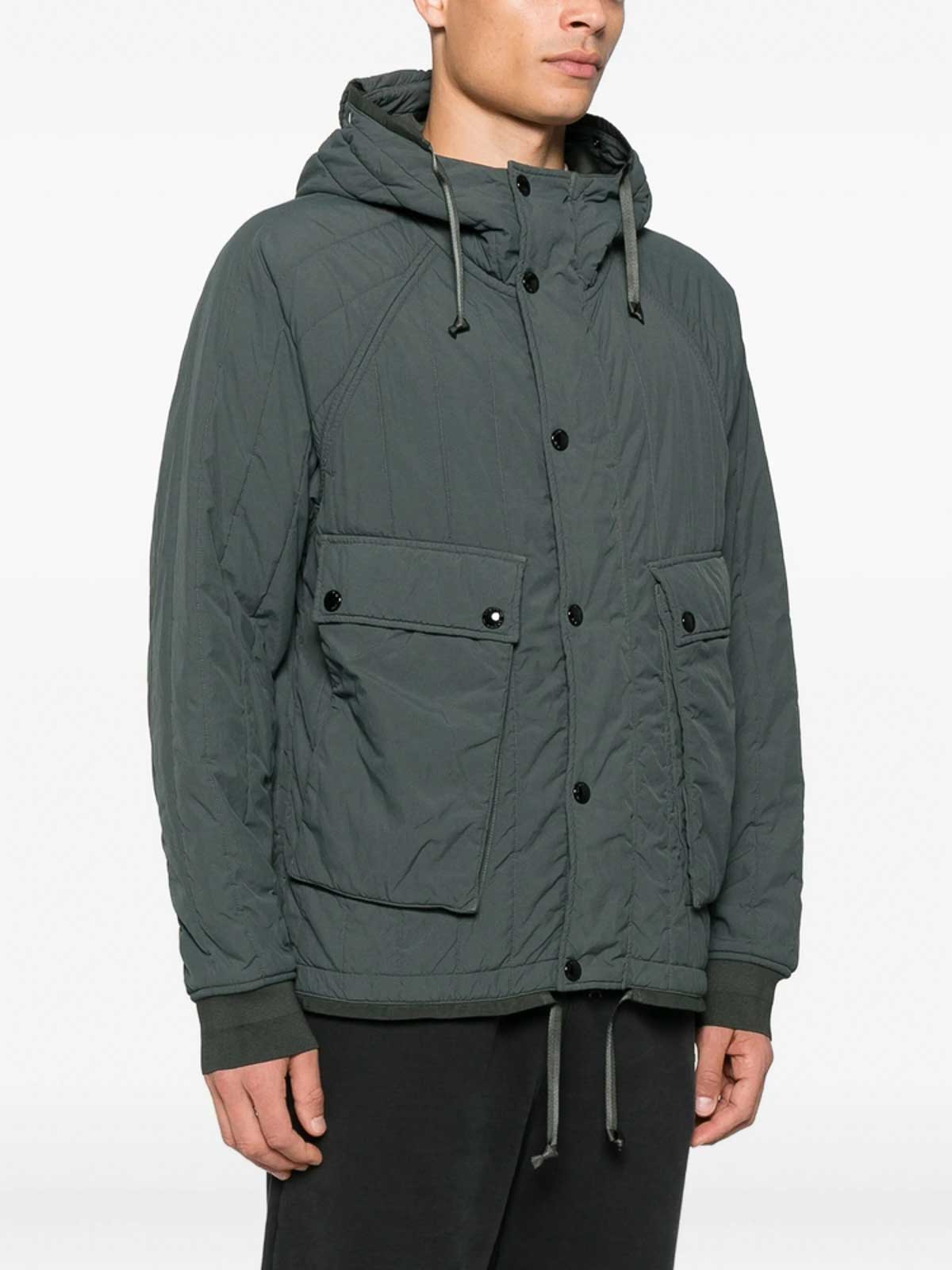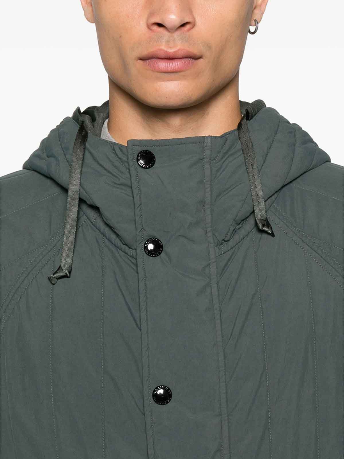 Dunkelgrünes, gestepptes Design, Kapuzenausschnitt, Knopfleiste, Leistentaschen, Kordelzug am Saum