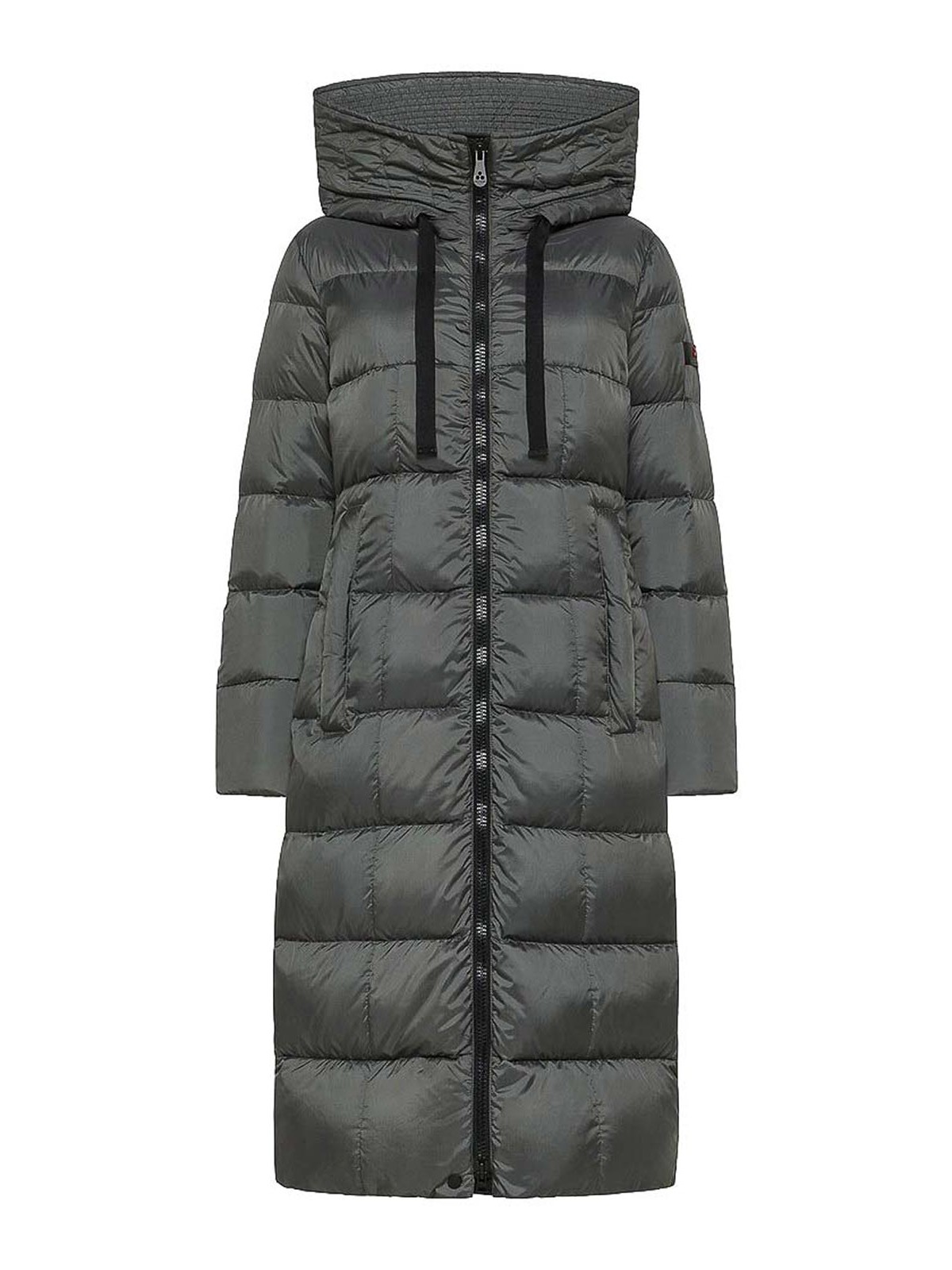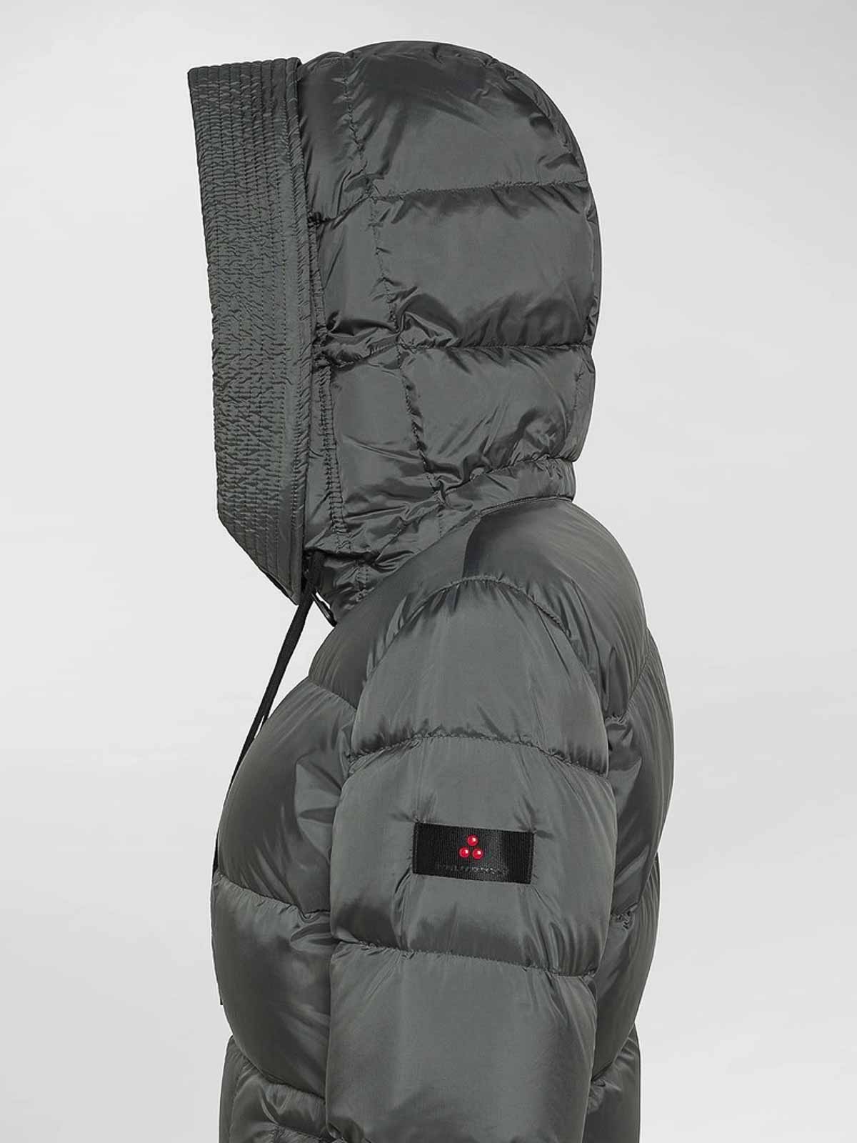 Lange Daunenjacke von Peuterey aus superleichtem, 100% recyceltem Polyester-Gewebe, seidenmatter Oberfläche und ultrakompakter Struktur, natürlicher Daunenpolsterung, hoher Kragen, fest verstellbarer Kapuze, doppelter Reißverschluss und große Seitentaschen. t