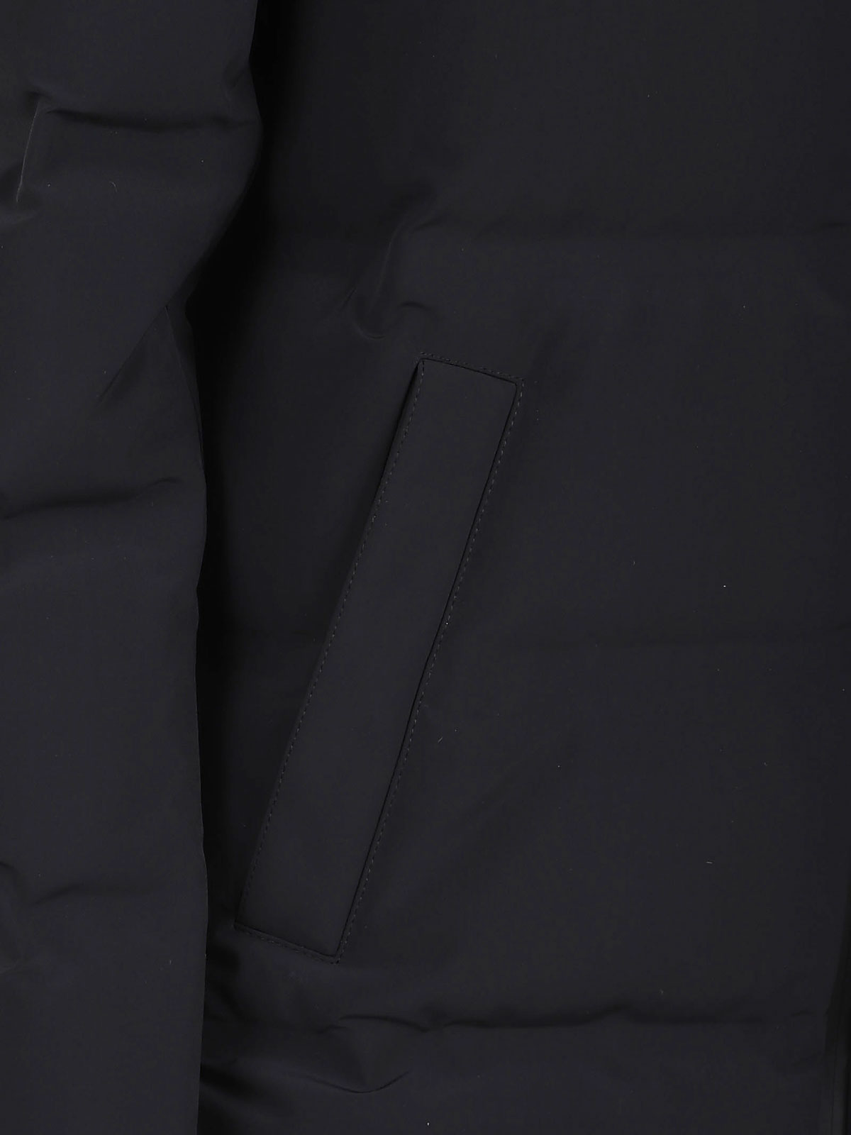 Herno Daunenjacke mit verdecktem Doppelschieber-Reißverschluss, Kapuze mit Knöpfen, die einen umhüllenden Kragen bilden, zwei schräge Taschen mit Reißverschluss, reguläre Passform, Ärmel aus technischem Gewebe.