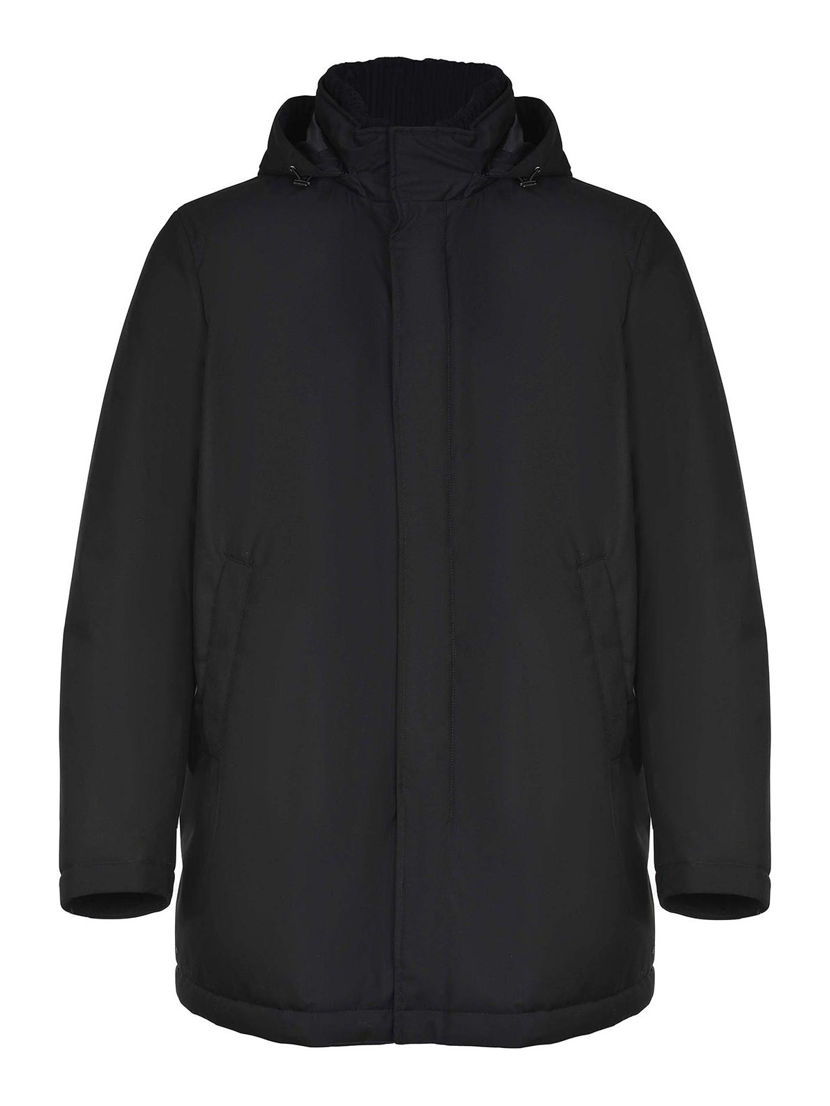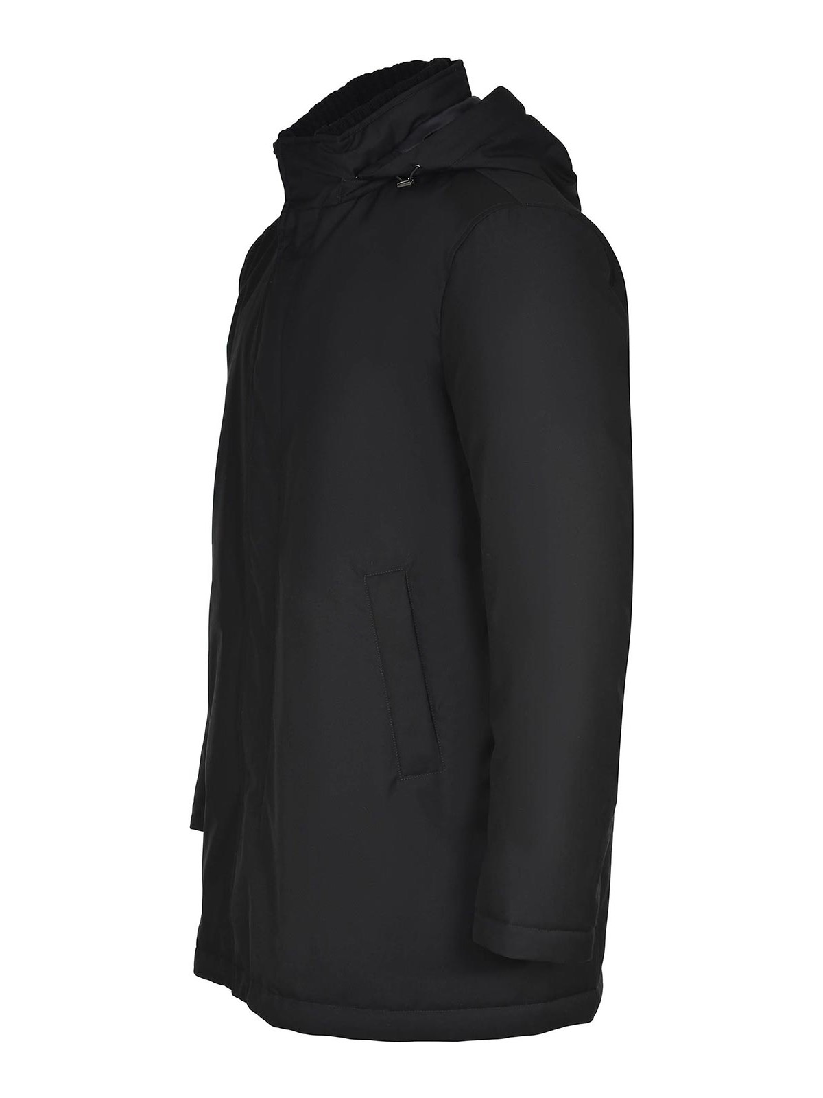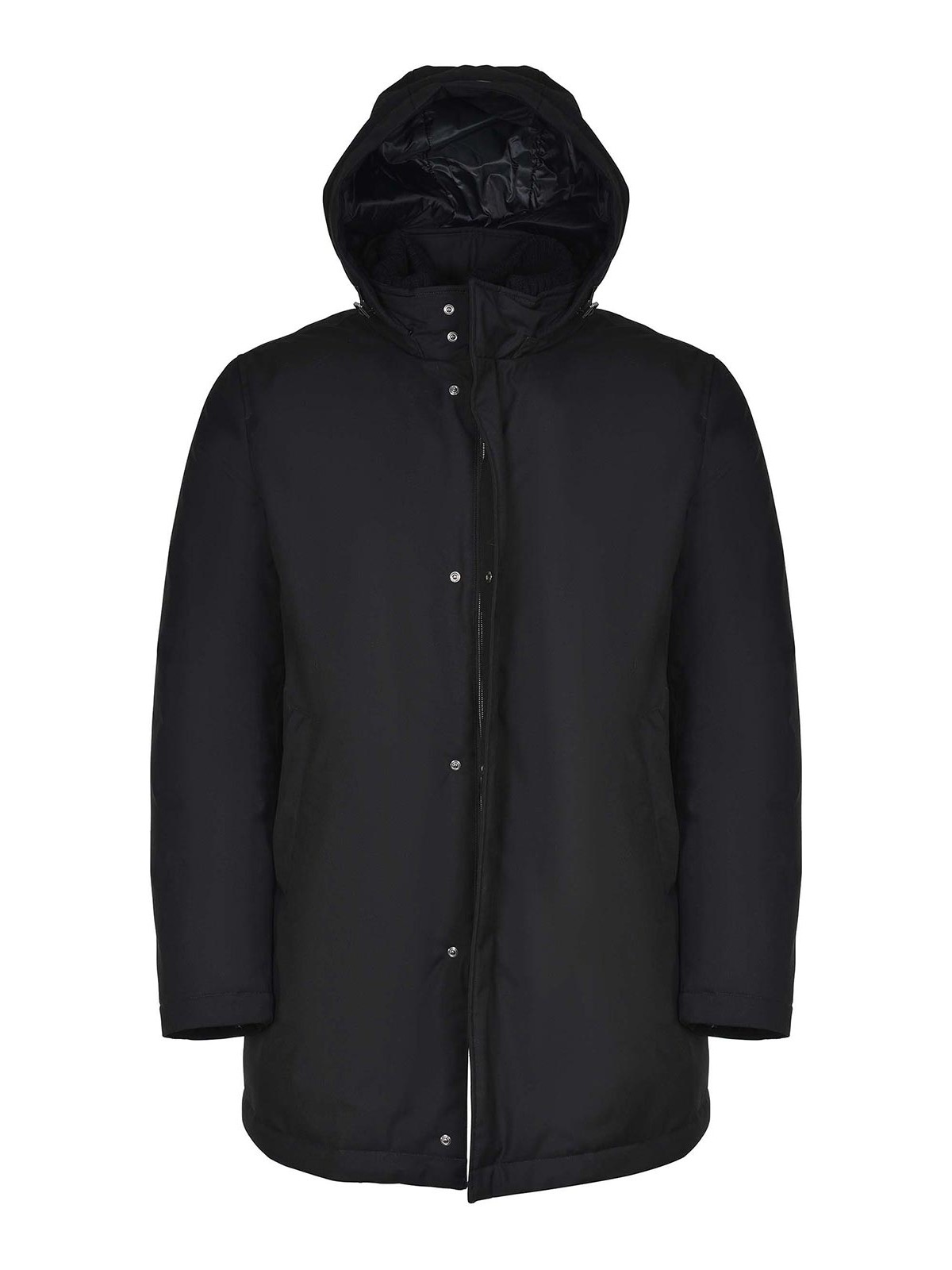 Daunenjacke Herno aus schwarzem technischem Gewebe. Kapuze mit elastischem Kordelzug. hoher Kragen, mit Rippstrick veredelt. Lange Ärmel. Verschluss mit Druckknöpfen und Zwei-Wege-Reißverschluss. Seitentaschen. Logo-Patch aus Metall an der Kapuze und auf der Rückseite. Gänsedaunenpolsterung. Reguläre Passform. Füllung: 80% Daunen, 20% Federn. Material: 80% Polyester, 20% Viskose
