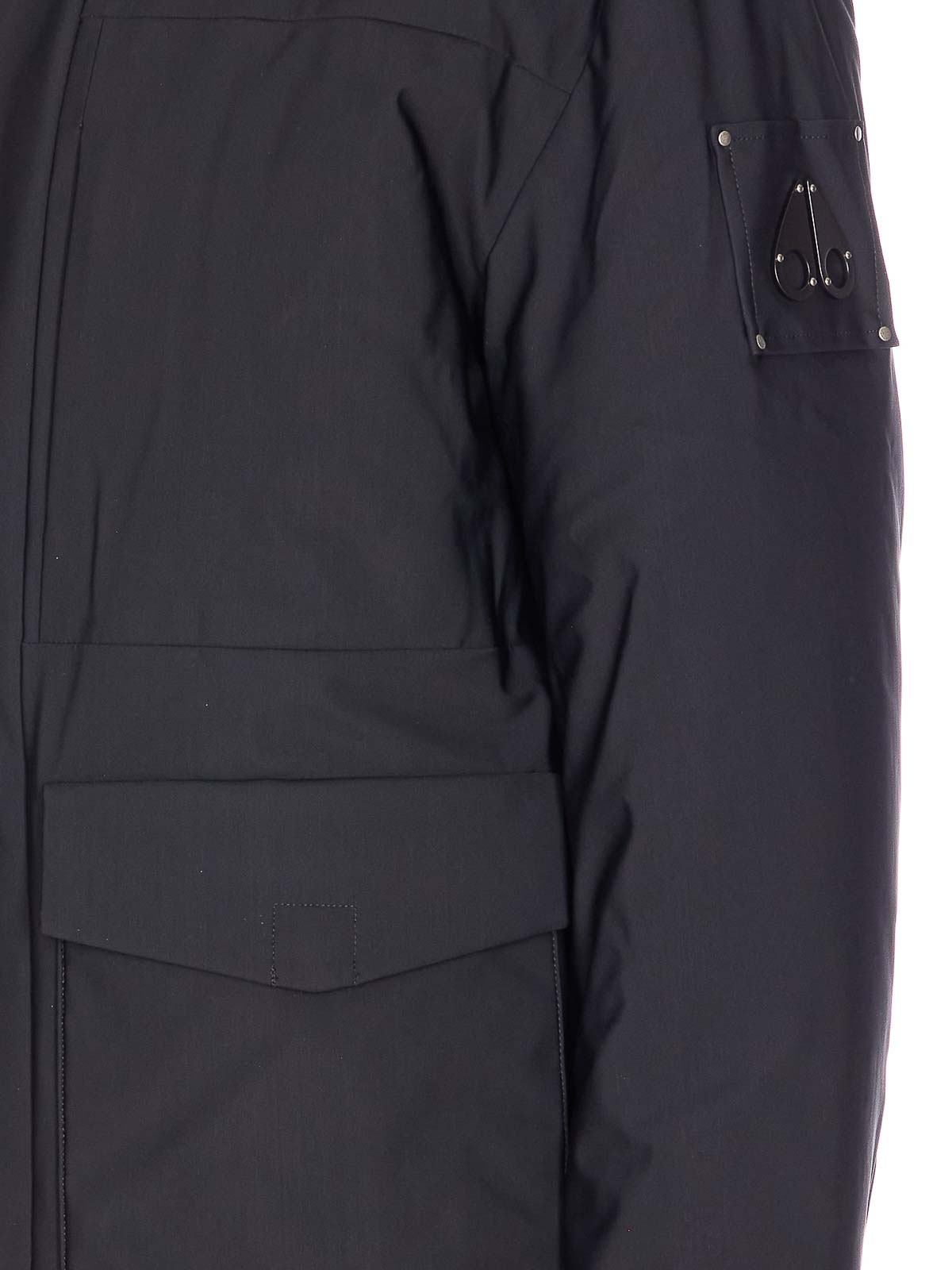 Moose Knuckles schwarze Voltaire 3Q Daunenjacke mit frontalem Reißverschluss, lange Ärmel, seitliches Logo-Patch, herausnehmbares Innendetail, gepolstert, Taschen, gepolsterte, abnehmbare Kapuze mit echtem Fell, Reißverschluss, gepolstert