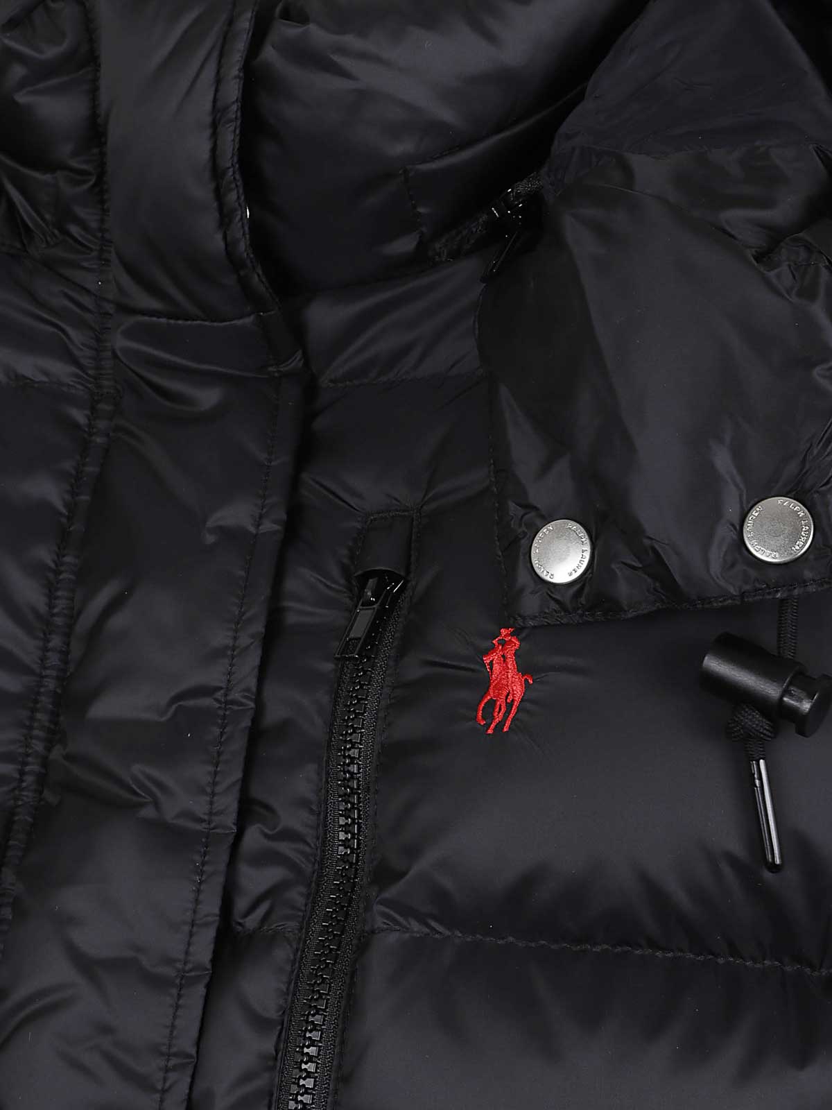 Gepolstertes schwarzes recyceltes Nylon mit verdecktem Druckknopfverschluss auf der Vorderseite, verdeckter Frontreißverschluss, gepolstertes Design mit gemischter Gänsedaunenfüllung, abnehmbare Kapuze, lange Ärmel, markantes Polo-Ponymuster, zwei Seitentaschen mit Reißverschluss, gerader Saum