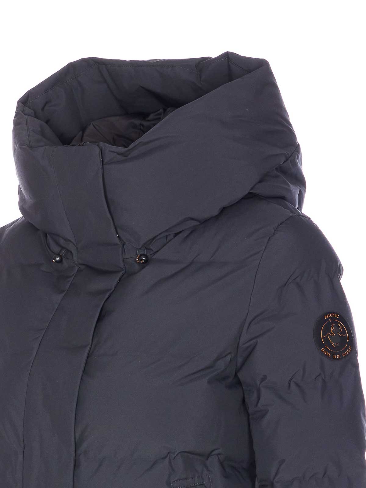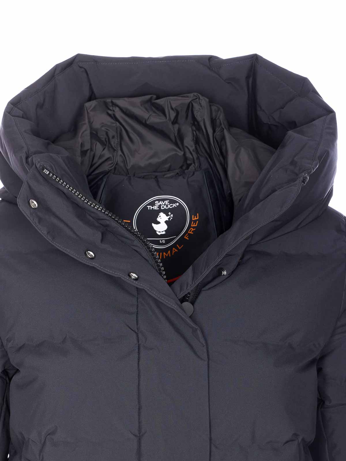 Schwarze Daunenjacke von Save the Duck mit Frontreiß- und Knopfverschluss, Kapuzendetail, langen Ärmeln, seitlichem Logo-Patch, Reißverschlusstaschen, gepolsterten, elastischen Ärmelabschlüssen