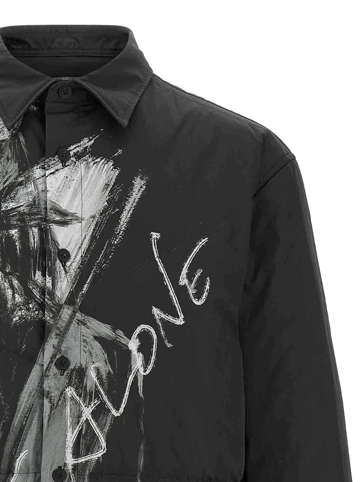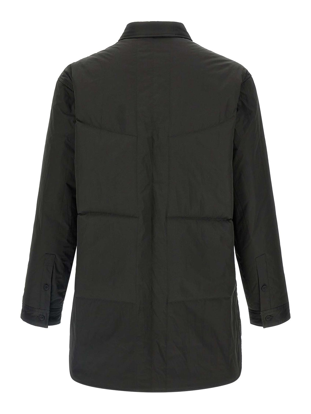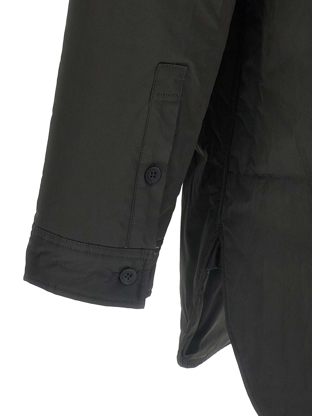 Leicht gepolstertes Nylon-Überhemd mit Frontprint, Kragen, vorderem Knopfverschluss, Seitenschlitzen, langen Ärmeln mit Manschetten.