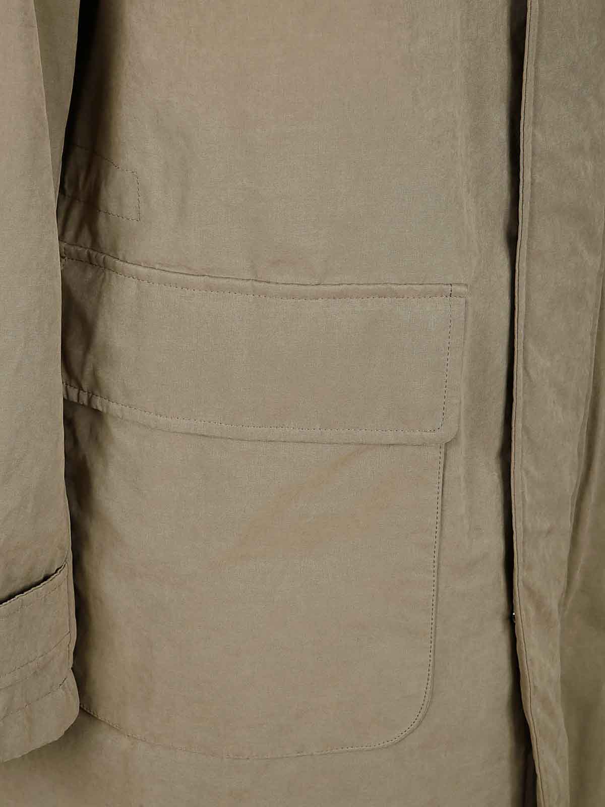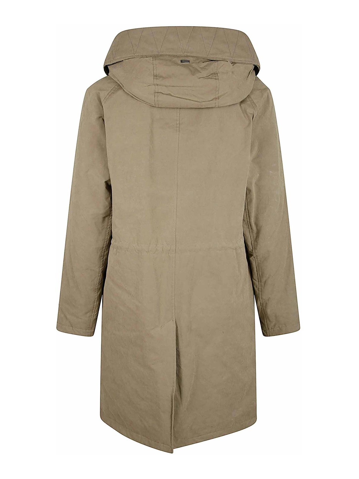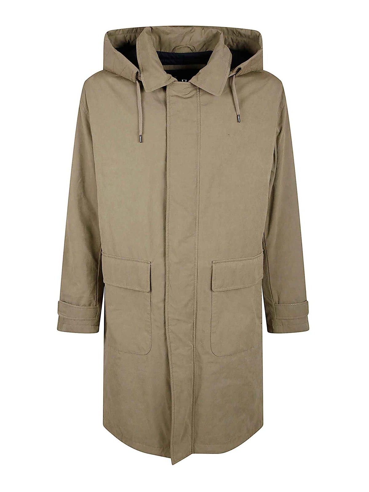 Langer Parka aus technischem Gewebe von Herno aus einer hochwertigen Mischung aus natürlichen Garnen und technischen Fasern, darunter Nylon und Polyester, Hemdkragen, abnehmbare Kapuze, Pattentaschen, Reißverschluss und Druckknopfverschluss, Ärmelbündchen mit Riemen, Daunenpolsterung, reguläre Passform und Rückenschlitz. Die Textur mit einem Herno-Logo aus Metall auf der Rückseite und der Haptik von Samt und Wachs sorgen für eine warme, umhüllende und faszinierende Haptik.