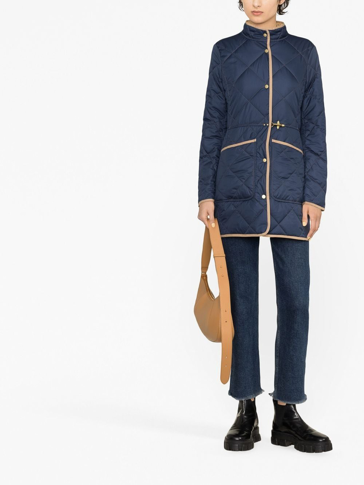 Figurbetonte Steppjacke von Fay mit folgenden Eigenschaften: Navyblau, Beige, Baumwolle, gesteppter, kontrastierender Rand, Stehkragen, Druckknopfverschluss vorne, Knebelverschluss, lange Ärmel, zwei aufgesetzte Fronttaschen und gerader Saum.