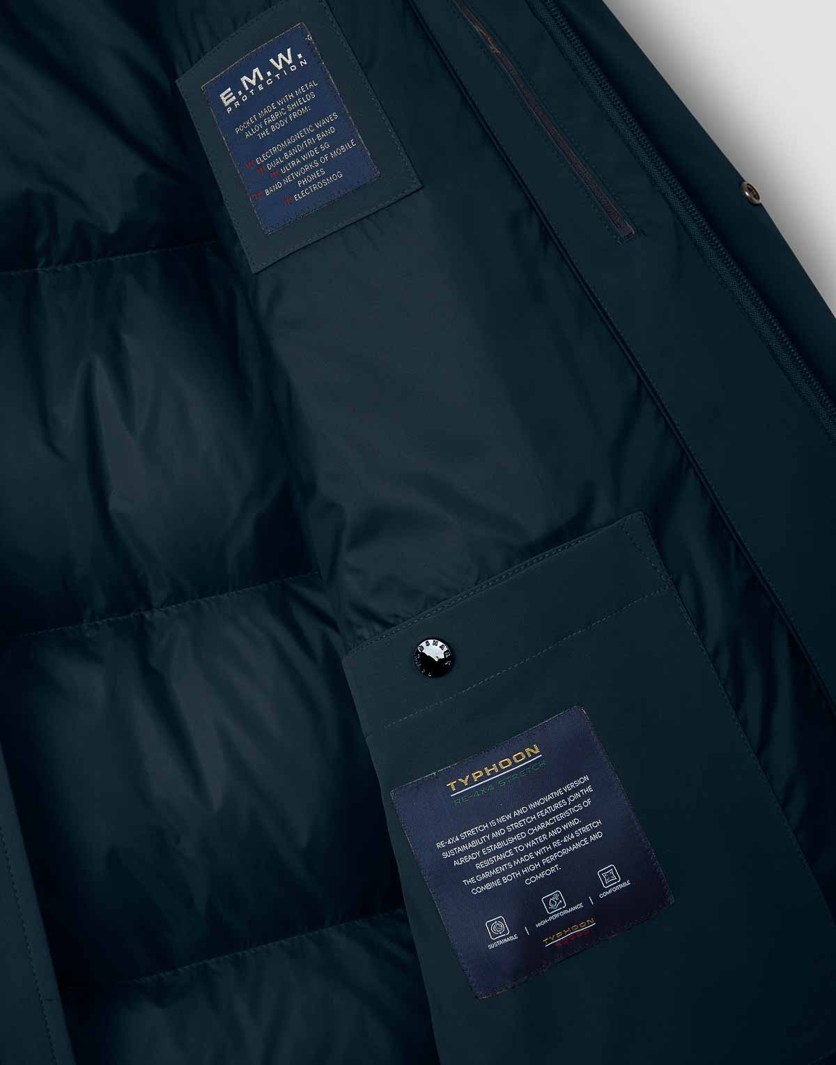 Paul & Shark Typhoon Re-4x4 Stretch lange Daunenjacke wasserdichtes technisches Gewebe langer Parka mit einem raffinierten und funktionellen Design aus Taifun Re-4x4 Stretch, einem leistungsstarken, vierfach elastischen technischen Gewebe, das Schutz vor Regen und Wind auf natürliche Weise den Bewegungen des Körpers folgt. Die Daunenpolsterung bietet Wärme und Leichtigkeit, während die abnehmbare Kapuze mit Kordelzug ermöglicht, den Stil an jeden Bedarf anzupassen. Der Doppelschieber-Reißverschluss und der Druckknopfverschluss die Außentaschen mit gummierten Reißverschluss und die internen Multifunktionstaschen einschließlich einer mit E M W Schutztechnologie zum Schutz vor elektromagnetischen Wellen vervollständigen ein technisches Kleidungsstück von großer Eleganz und Komfort, wasser- und winddichtes Taifun Re-4x4 Stretchmaterial, natürliche Daunenpolsterung, abnehmbare Kapuze mit Kordelzug, doppelter Schieberreißverschluss und Druckknopfverschluss, Außentaschen mit gummiertem Reißverschluss, interne Multifunktionstaschen, einschließlich e m w Schutz, Tasche, gesteppt, reguläre Passform