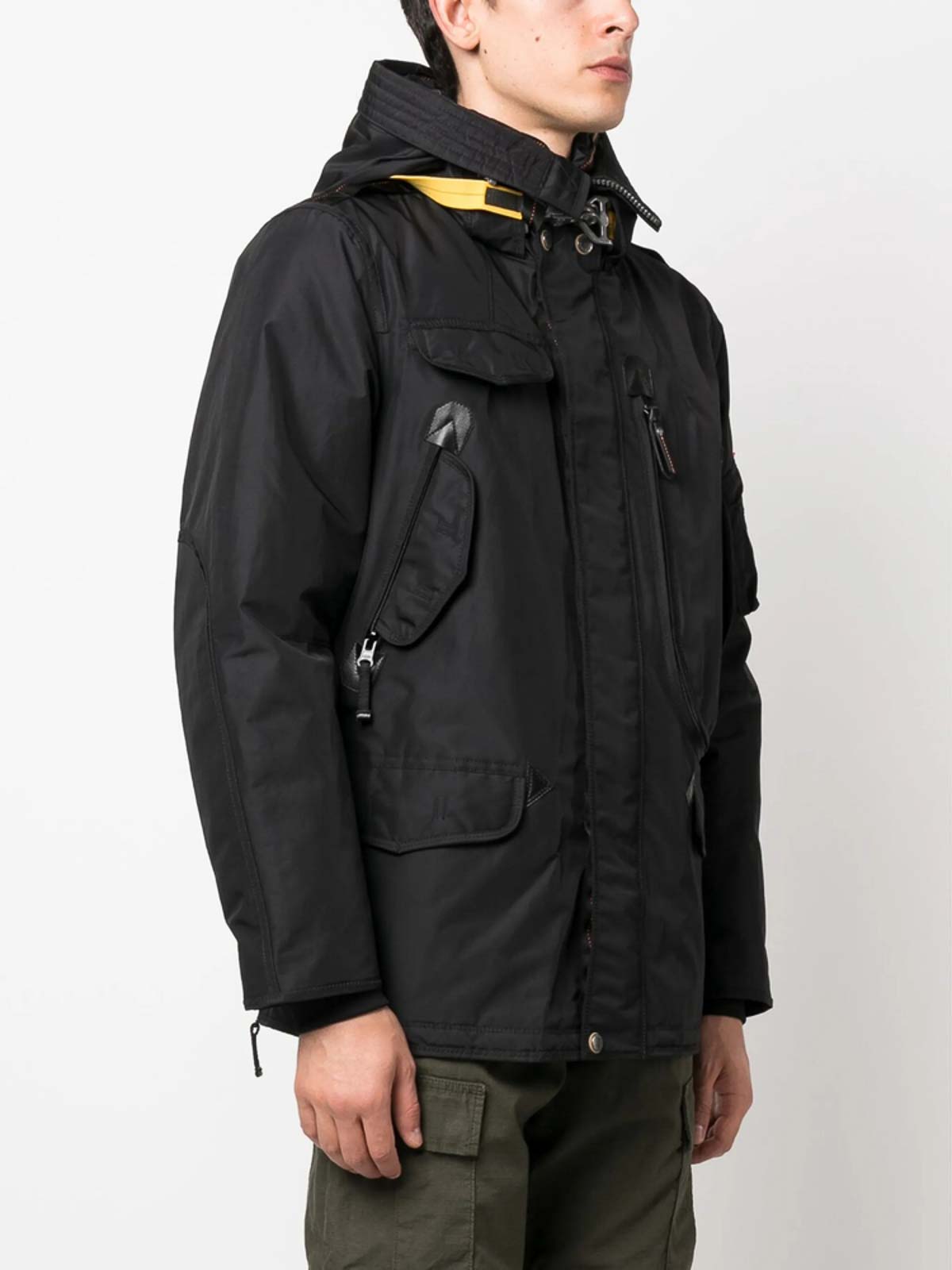 Schwarze, gemischte Riemendetails, klassische Kapuze, hoher Kragen, Haken, verdeckte lange Ärmel, Brusttaschen, Pattentaschen, Reißverschluss, Brusttasche, Reißverschlusstasche