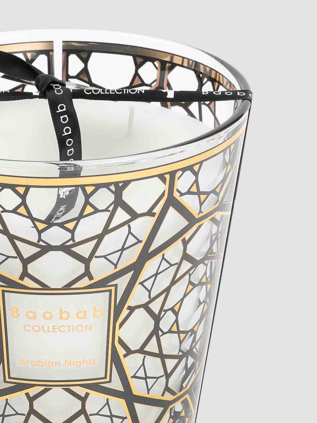 Baobab collection Arabian Nights Candle max16. Die Duftkerze Arabian Nights entführt uns in die geheimnisvolle Welt des Mittleren Osten. mit Glassiebdruck mit 9-karätigem Gold lässt sie sich von den berühmten Moucharabieh inspirieren, offenen Werkmotiven der arabischen Architektur. Durch das Glas erscheint die Flamme, während sie einen umhüllenden Schatten erzeugt. Safran - Oud - Weihrauch. sein Duft nach Oud, Safran und Weihrauch ist eine Einladung zu einer imaginären Reise durch das Land der Tausendundeine Nächte. wir akzeptieren keine Rücksendungen für diesen Artikel