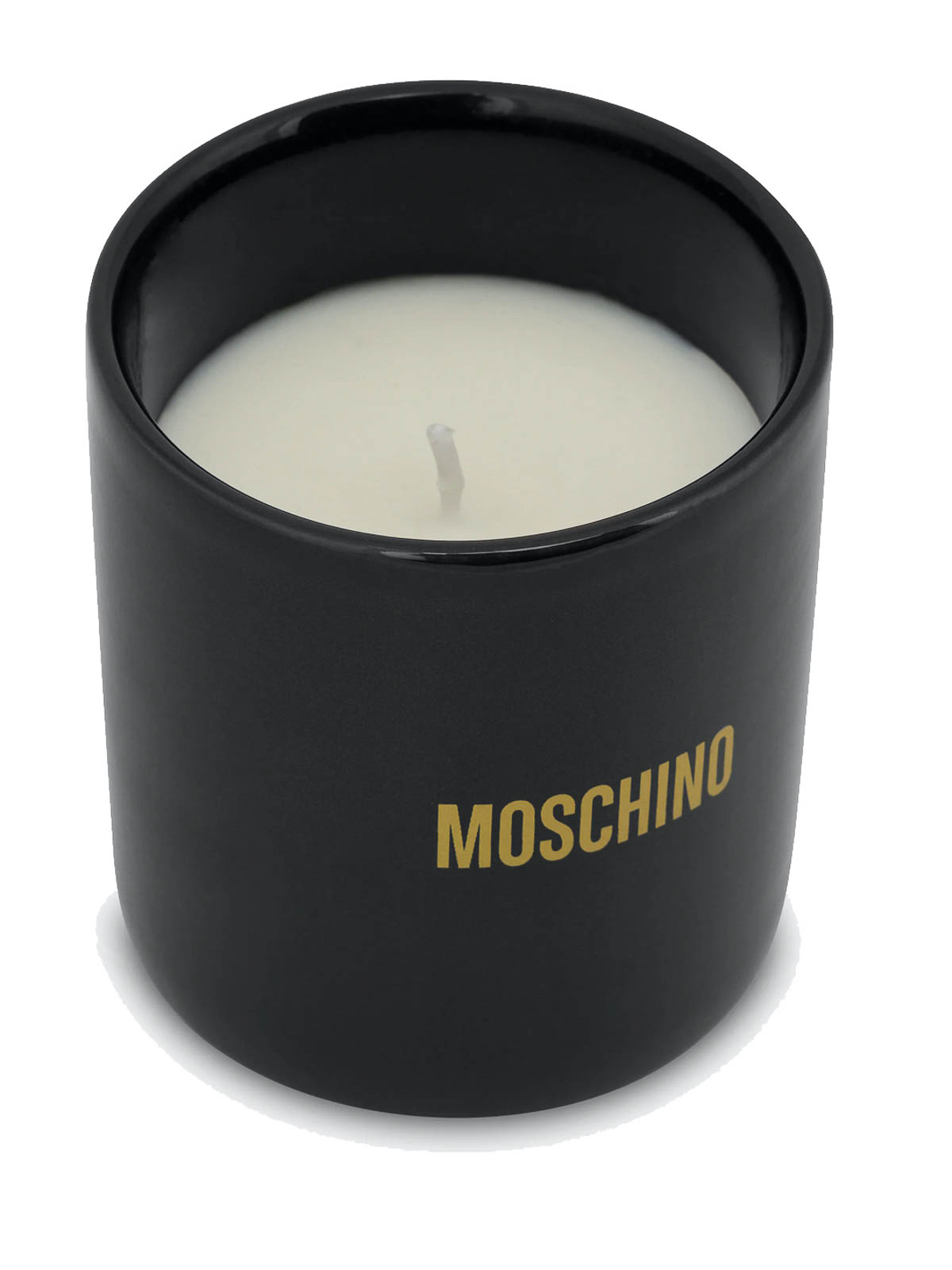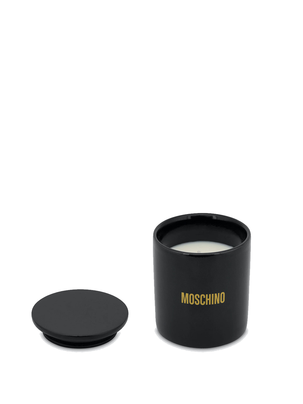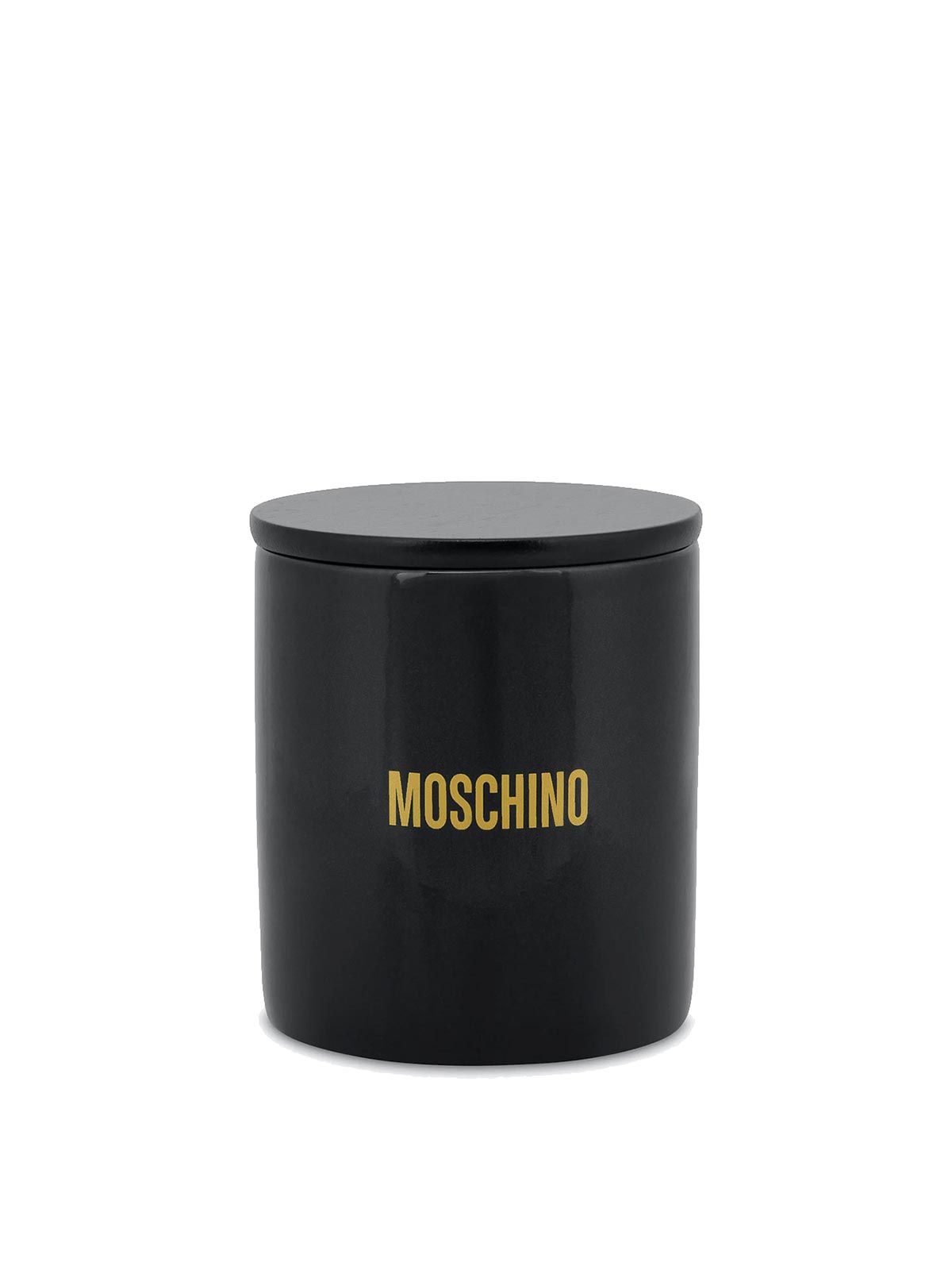 Duftkerze Moschino Geschenkkapseln in schwarzer Duftkerze aus Keramik mit glänzender Oberfläche mit goldfarbenem Logo und flachem Deckel
