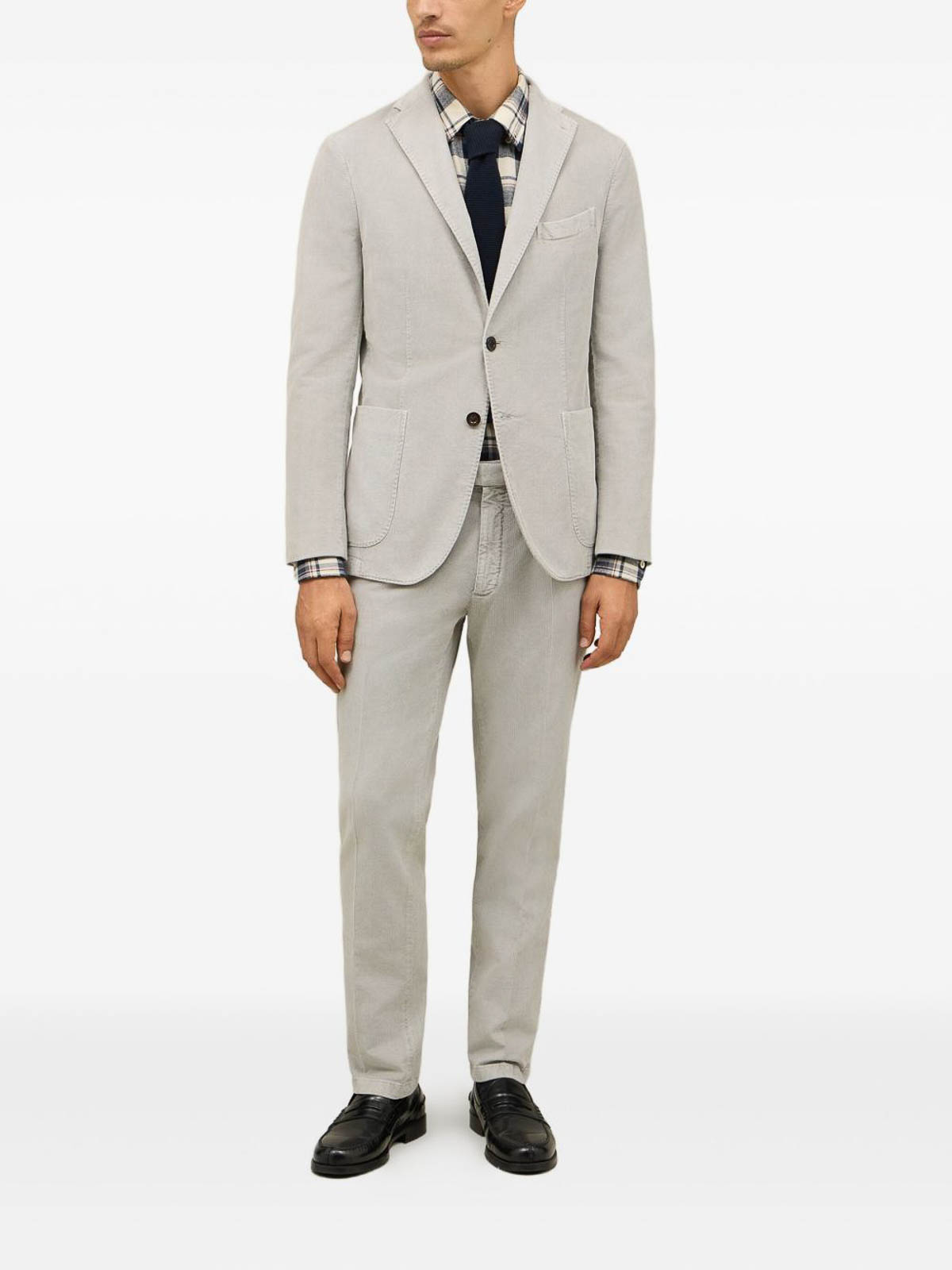Hellgraue, aufgesetzte Taschen mit zwei Knöpfen, gekerbtes Revers, gerade Hose