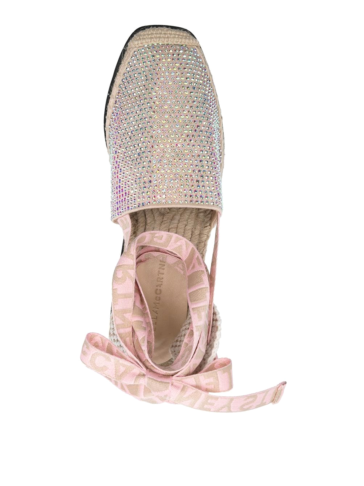 Plateau-Espadrilles von Stella McCartney mit Gaia-Kristallen und folgenden Eigenschaften: mehrfarbiger Riemen mit Logo-Print, Glaskristallverzierung, runder Zehenpartie und Plateausohle.