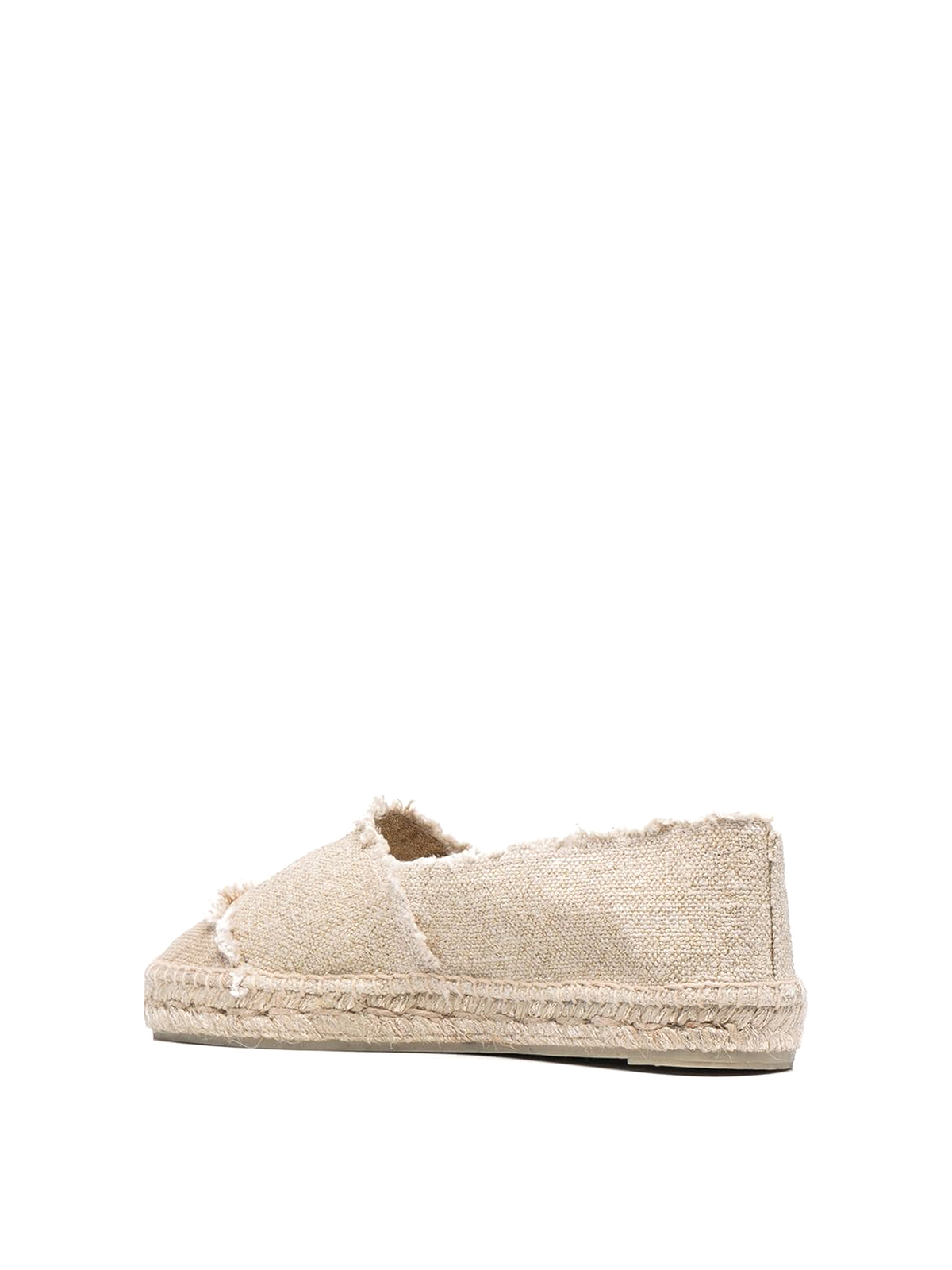 Zweifarbige Kampala-Espadrilles aus elfenbeinfarbenem Weiß/Beigefarbenem Canvas von Castaer mit zweifarbigem Design, ausgefranster Kante, Markeninnensohle, runder Spitze, Slip-On-Stil und geflochtener Bastsohle.