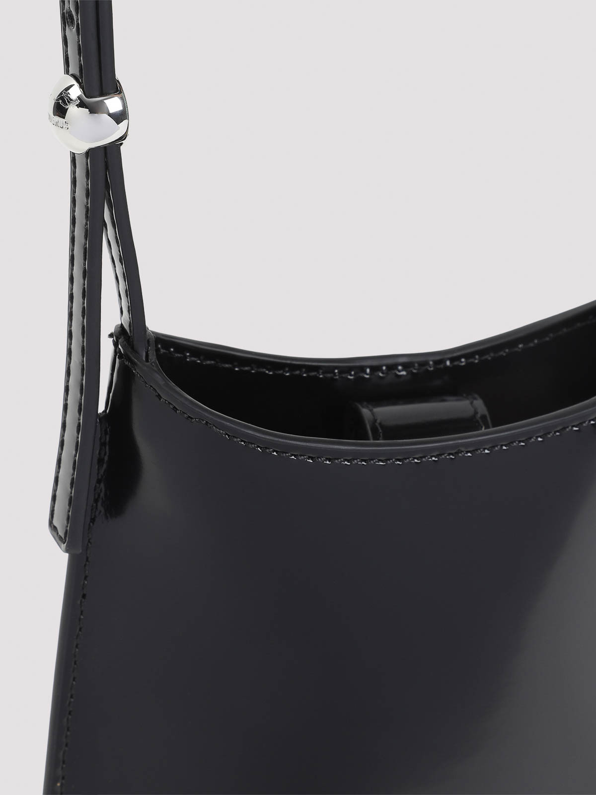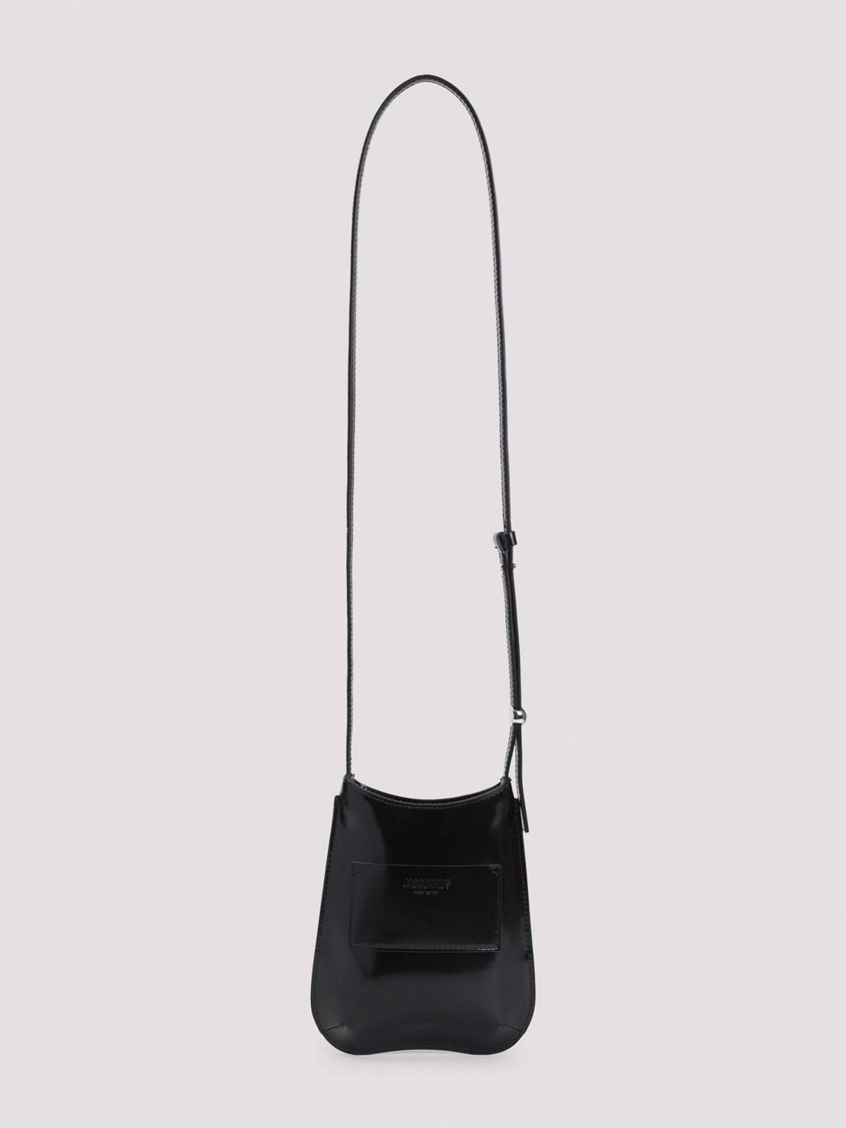 Jacquemus the Bisou Handytasche aus schwarzem Kalbsleder. Hergestellt aus schwarzem Kalbsleder, mit einer Handyhalterform, einem Magnetverschluss, einem verstellbaren Schultergurt, einem Kartenfach auf der Rückseite und einem Bein? Perlendetail aus Metall mit Bisou-Gravur.