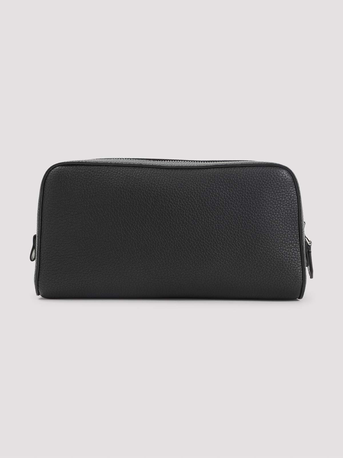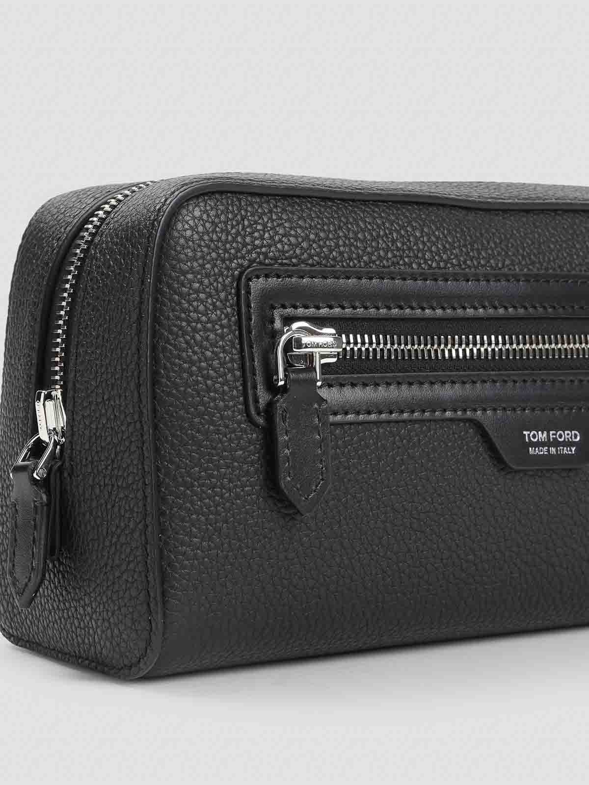 Tom Ford Kosmetiktasche aus schwarzem Kalbsleder. Hergestellt aus schwarzem genarbtem Leder, goldfarbene Hardware, oberer Reißverschluss, Reißverschlusstasche auf der Vorderseite, Logo-Prägung auf der Vorderseite, gefüttert.