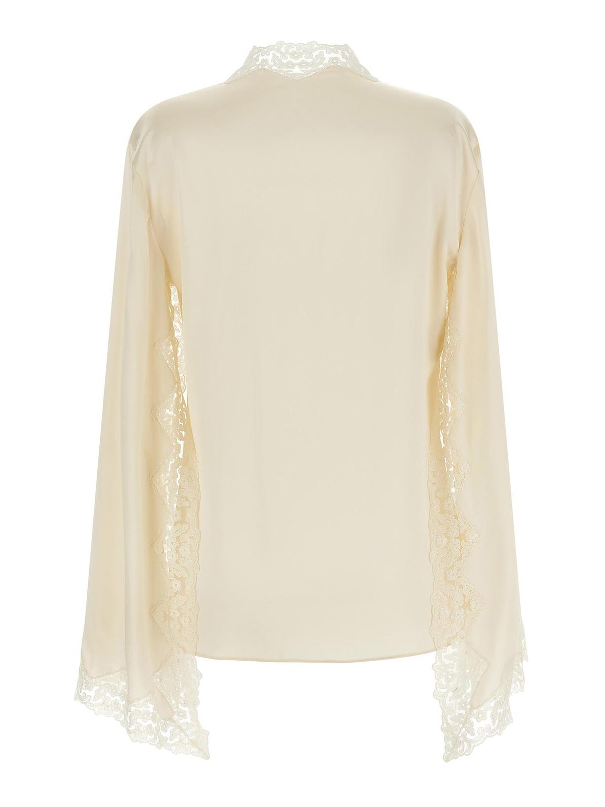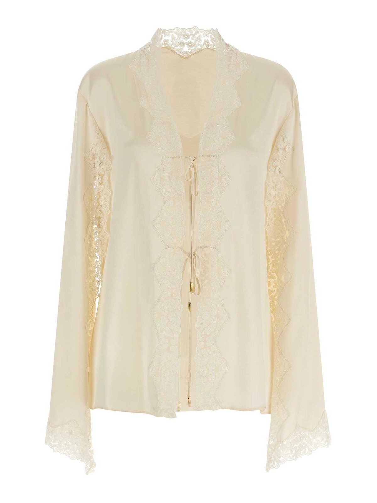 Glänzendes Satinhemd mit farblich abgestimmten Spitzeneinsätzen im Morgenmantel-Stil mit Schnürsenkeln an der Vorderseite und langen Cape-Ärmeln.