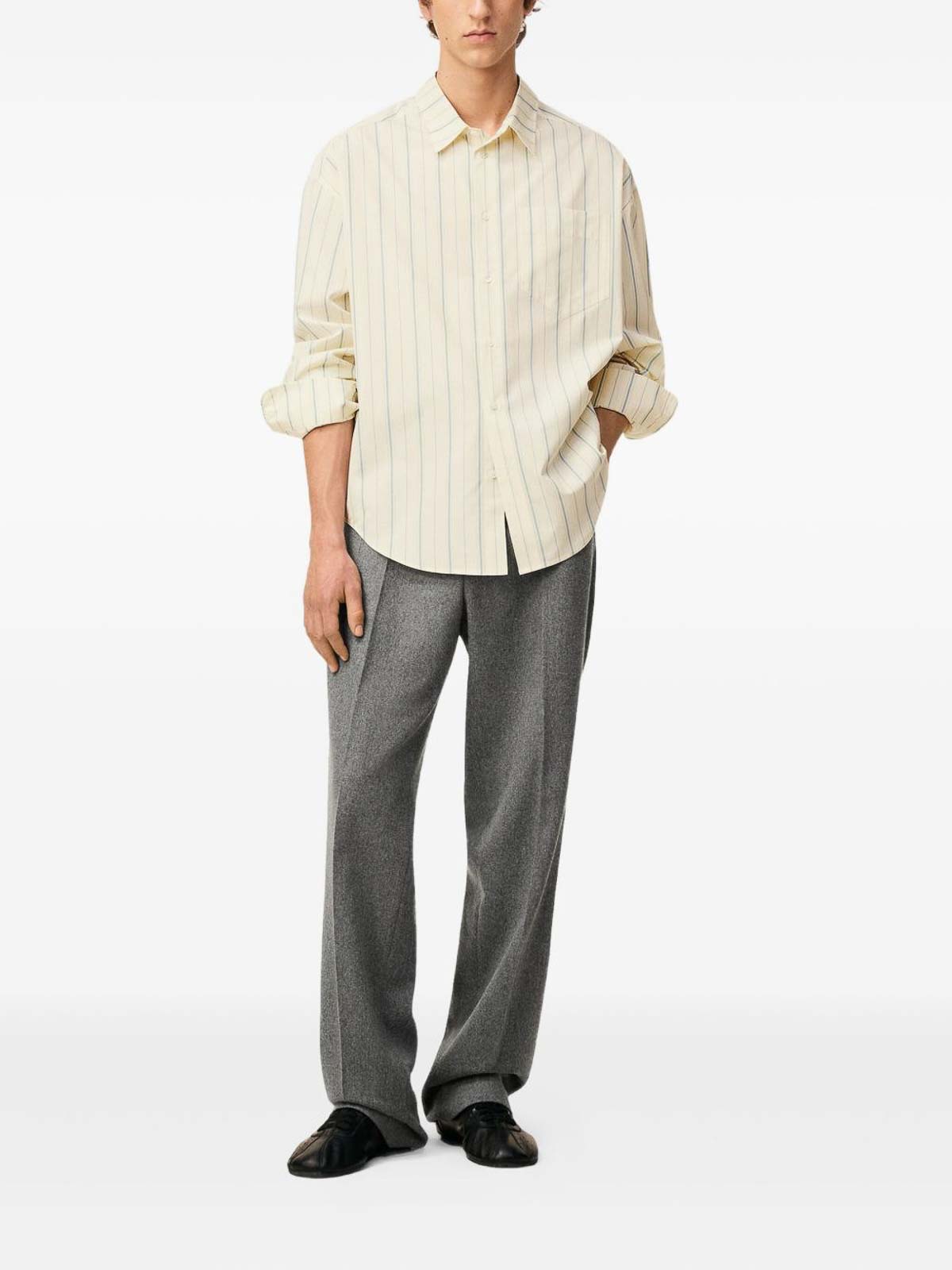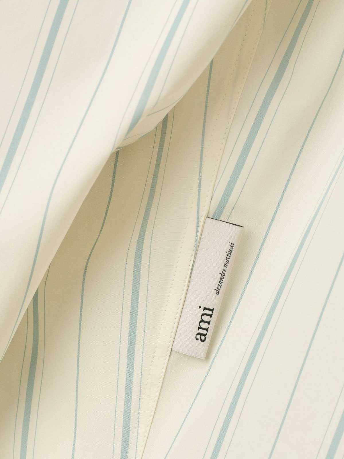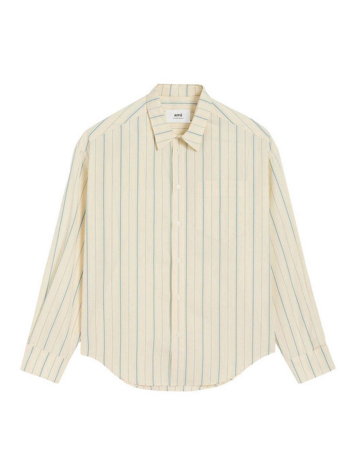 Beigefarbene vertikale Linien, klassischer Vorderkragen mit Taschenknopf auf der Brust, lange Ärmel, geschwungener Rand