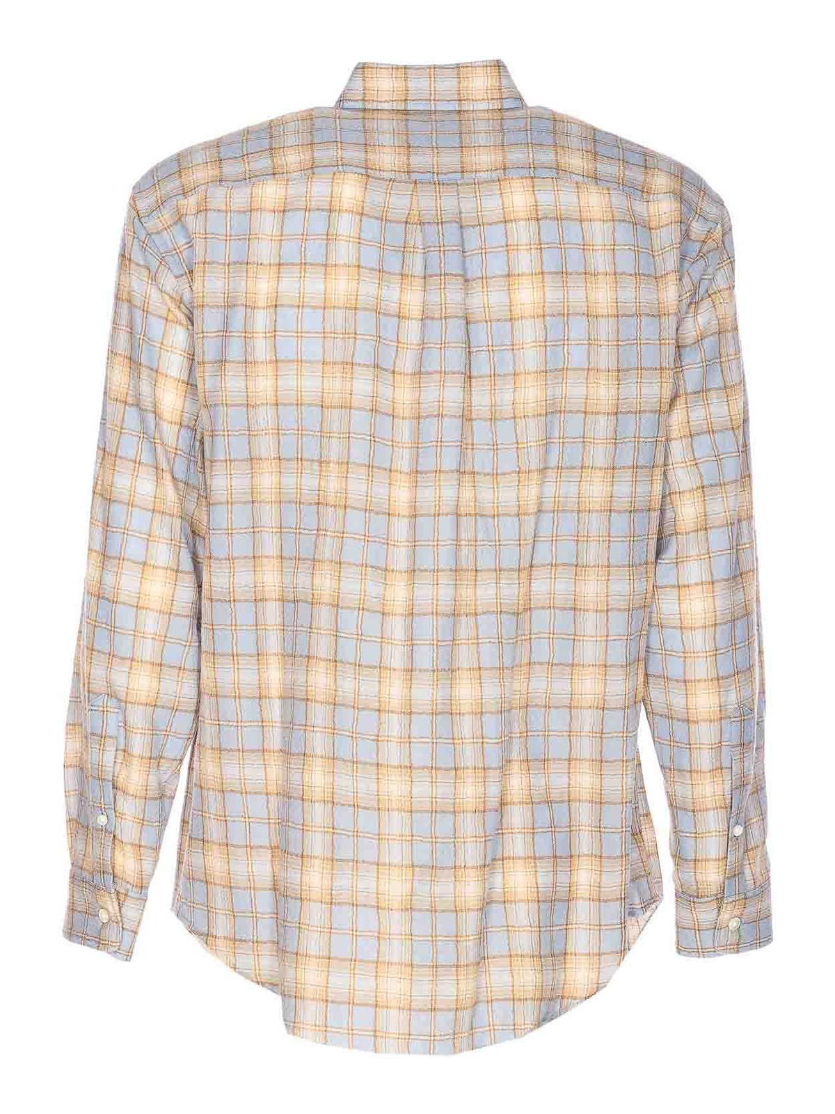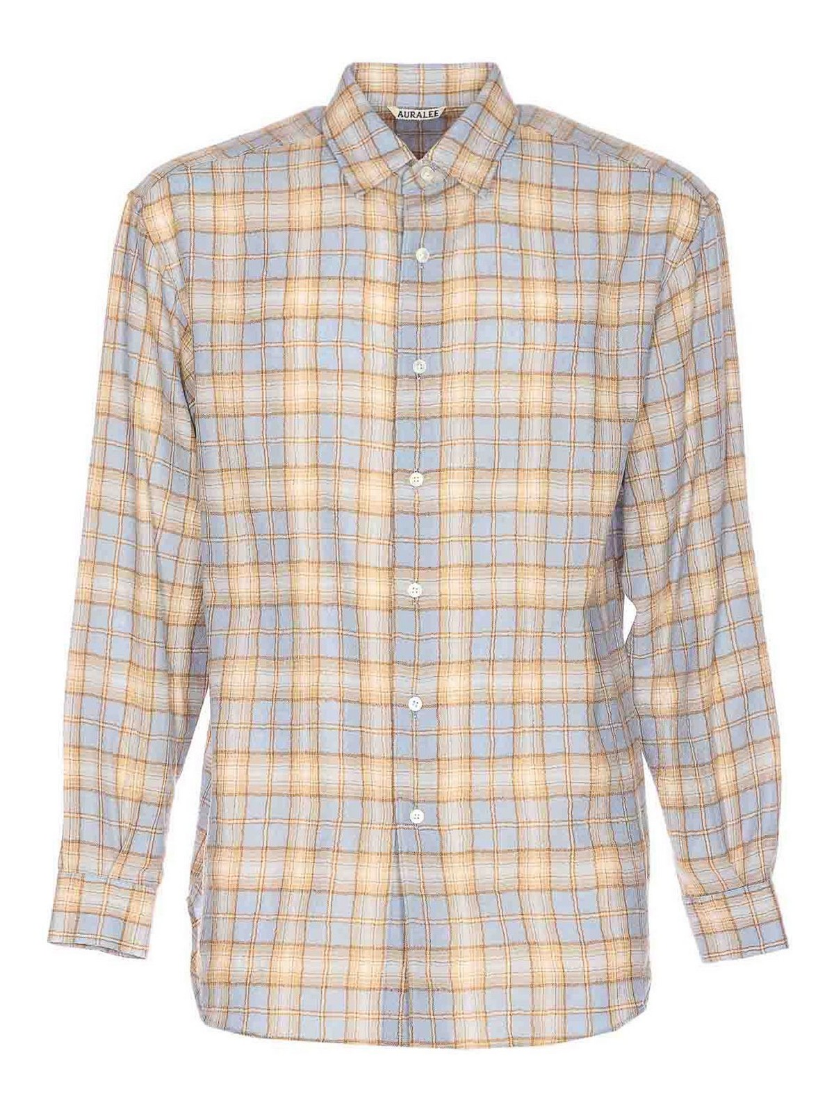 Hellblaues, luftiges Wollkarohemd von Auralee mit vorderem Knopfverschluss, langen Ärmeln, normalem Kragen, Knöpfen an den Manschetten