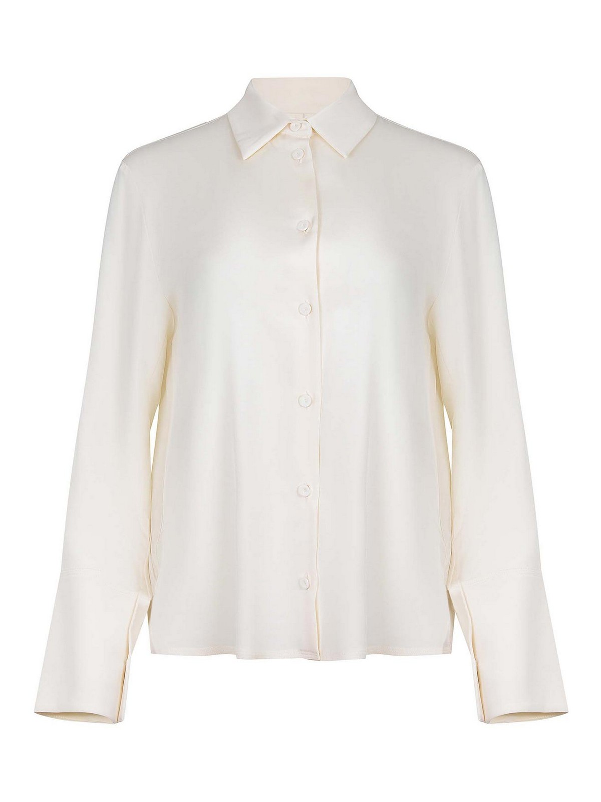 Max Mara Mxpvolier-Hemd aus cremefarbener Seidenmischung. Klassischer Kragen. Knopfverschluss auf der Vorderseite. Lange Ärmel. Knopfmanschetten. 93% Seide, 7% Elastan. Hergestellt in Italien