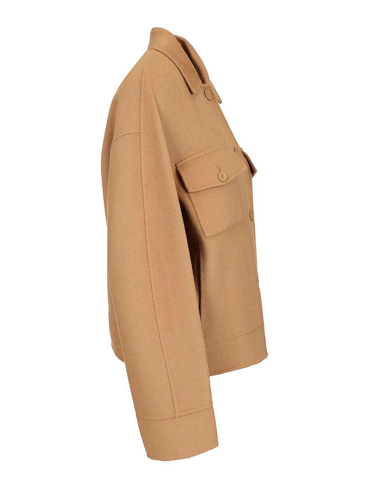 Boxy-Jacke aus Wolle, Kaschmir und Seide. Hemdkragen. Lange Kimonoärmel auf der Vorderseite und am unteren Rücken. Vorderer Verschluss mit sichtbaren Knöpfen.