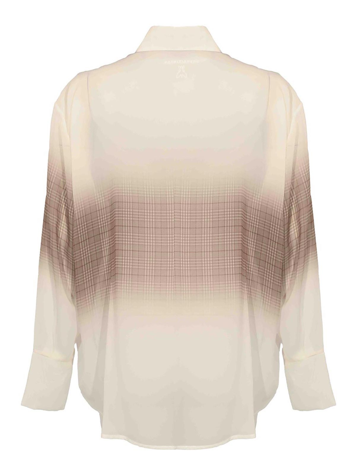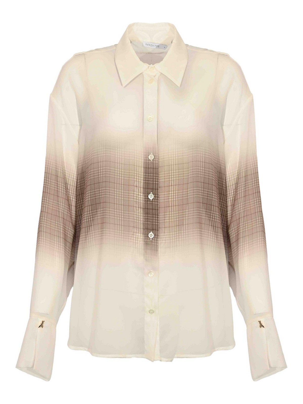 Leichtes, halbtransparentes Chiffonmuster, schattiertes Karomuster in Beige- und Brauntönen, lange Ärmel mit breiten Manschetten und Logo-Fly-Knopfkragen, klassischer Punkt mit Knöpfen, Taschen, kein Schattenprint mit Fade-Out-Effekt, Ton in Ton, Patrizia Pepe-Logo auf der Rückseite gedruckt, entspannte Passform mit geradem Schnitt, leicht durchsichtig, ohne Passform, Oversized