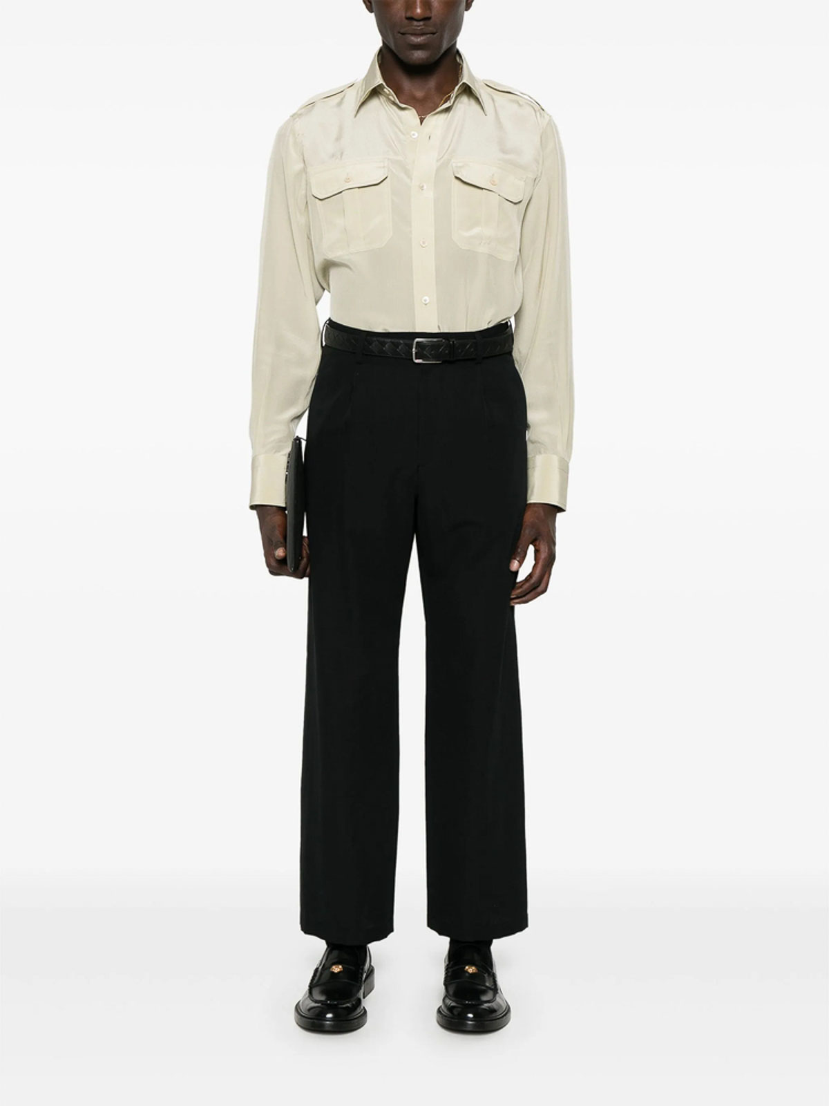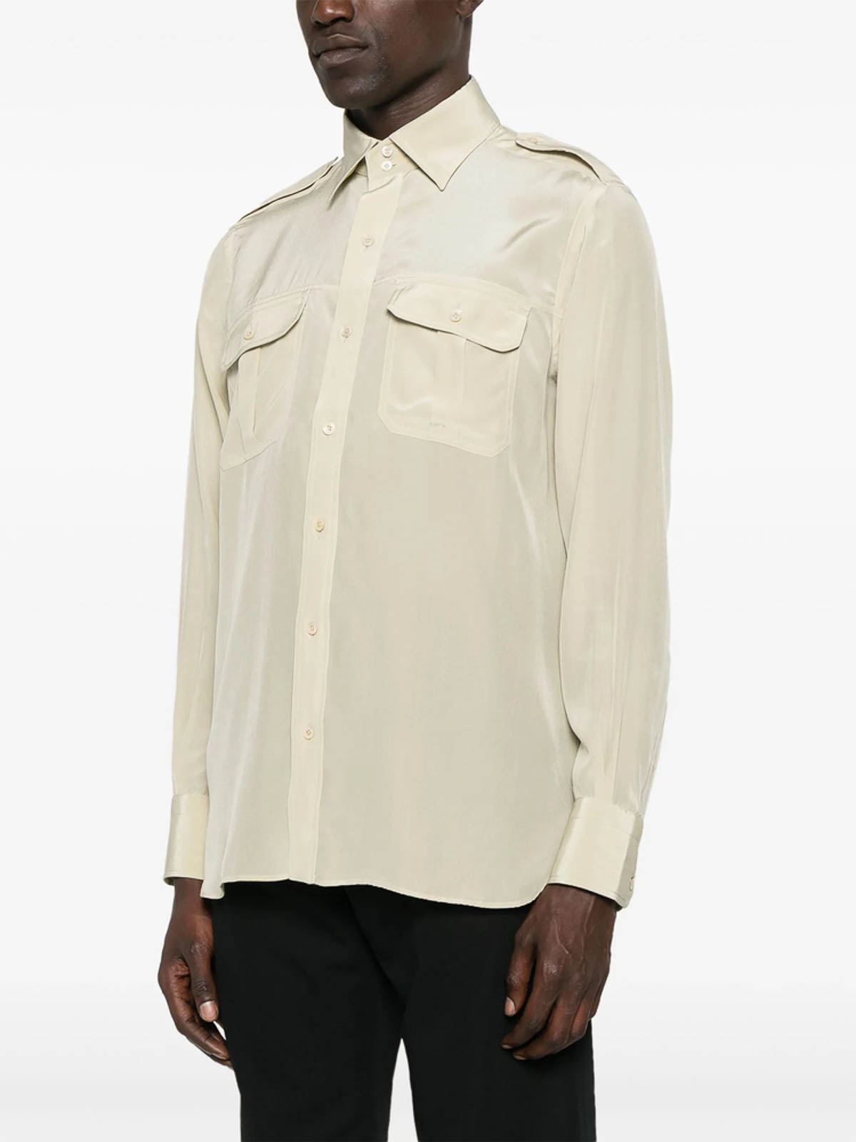 Hellbeige Knopfleiste, zwei Brusttaschen, geknöpfte Manschetten, Schulterklappen